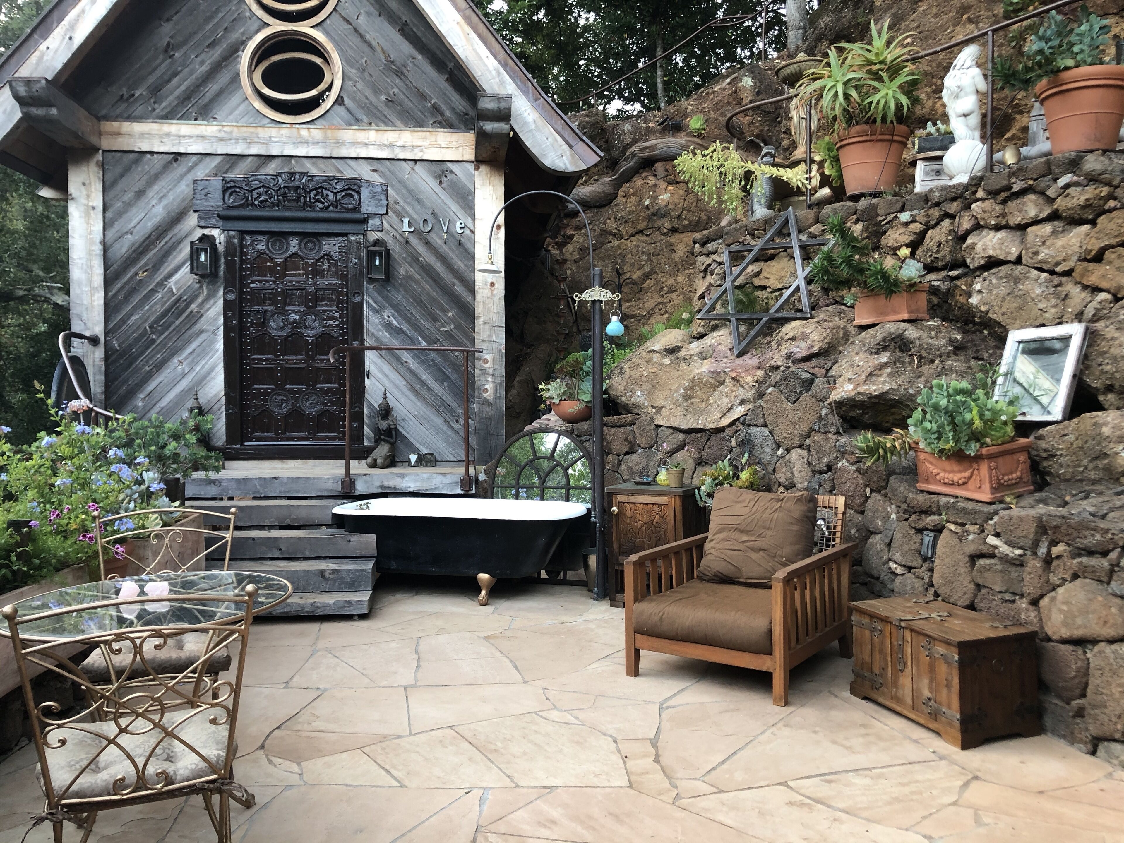 LOVE Temple is a shrine representing Sacred Union with Self and the Universe. Inviting Solo Journeyer's on a spiritual or healing path. Enter the portal and arrive at your own unique destination, immersing yourself in the energies of this womb-like space while taking in the natural beauty of the sacred land it nests on. Massive cedar stairs encase a clawfoot tub with shower just waiting to soothe and rejuvenate along with a large salt water spa.
