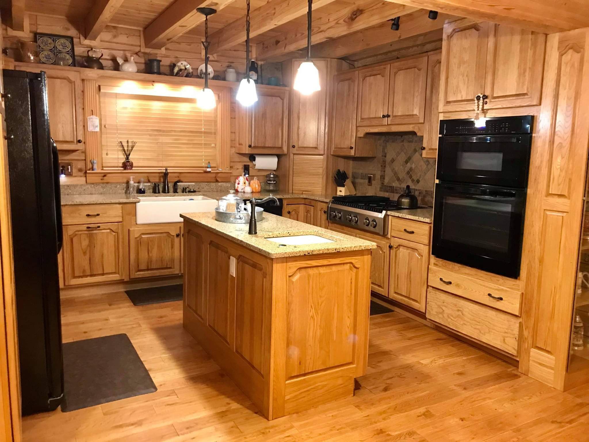 - Dining area & kitchen feature hickory custom cabinets, granite counter tops, walk around center isle with service sink, farm sink, commercial grade 6-burner gas cook-top, side by side refrigerator, double oven/ microwave (convection oven), built in cabinet, garbage disposal and large pantry