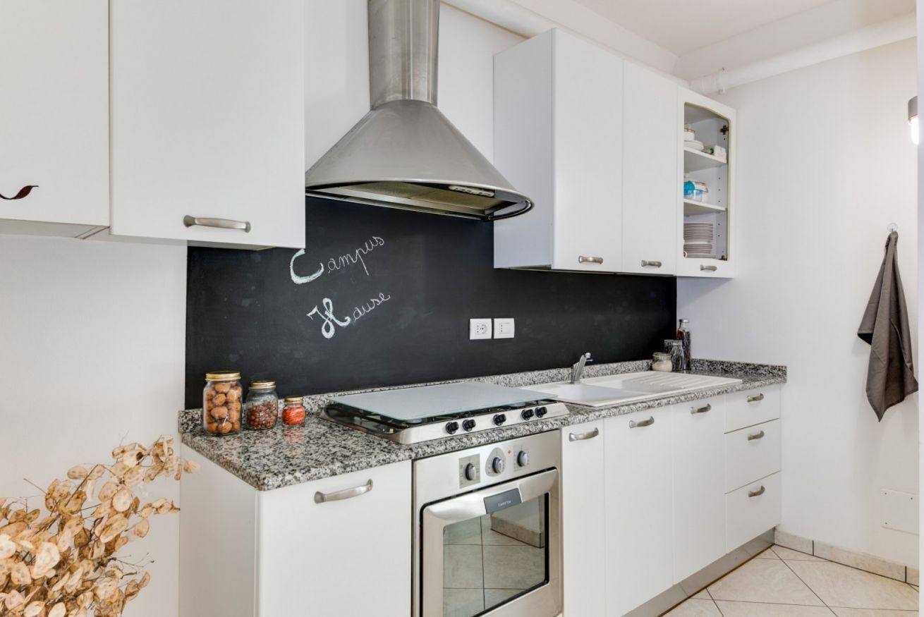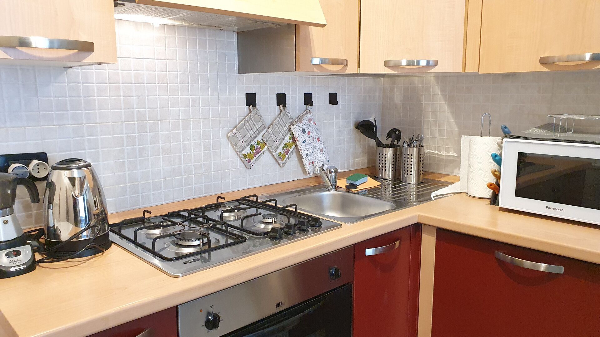 The kitchen is complete with all accessories: plates and cutlery, refrigerator, dishwasher, oven, microwave, kettle, coffee maker.