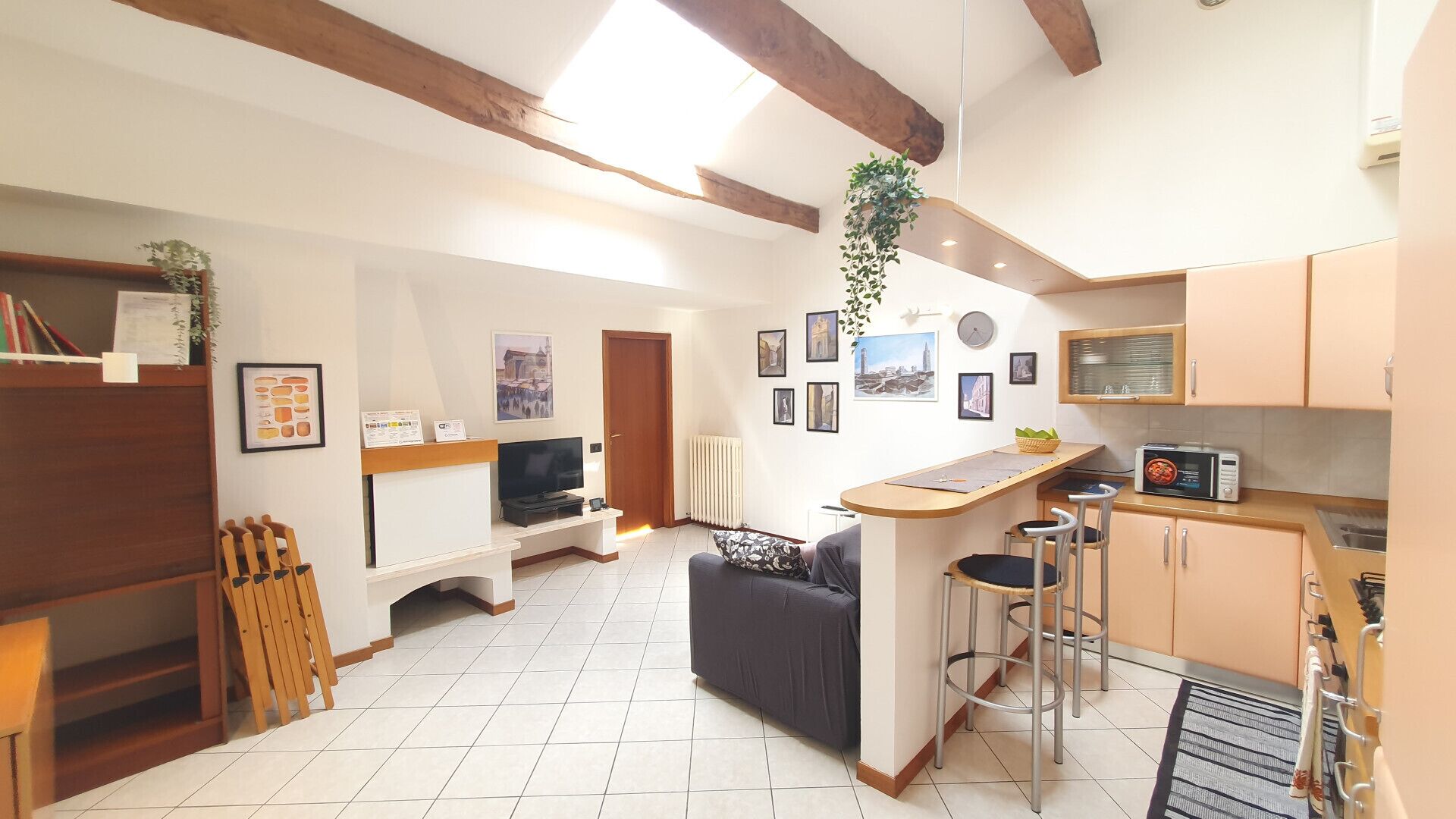 Thanks to large French doors with railings both rooms are very bright and enjoy a unique view of the dome of the Cathedral of Santa Croce, the Cathedral of Forlì.