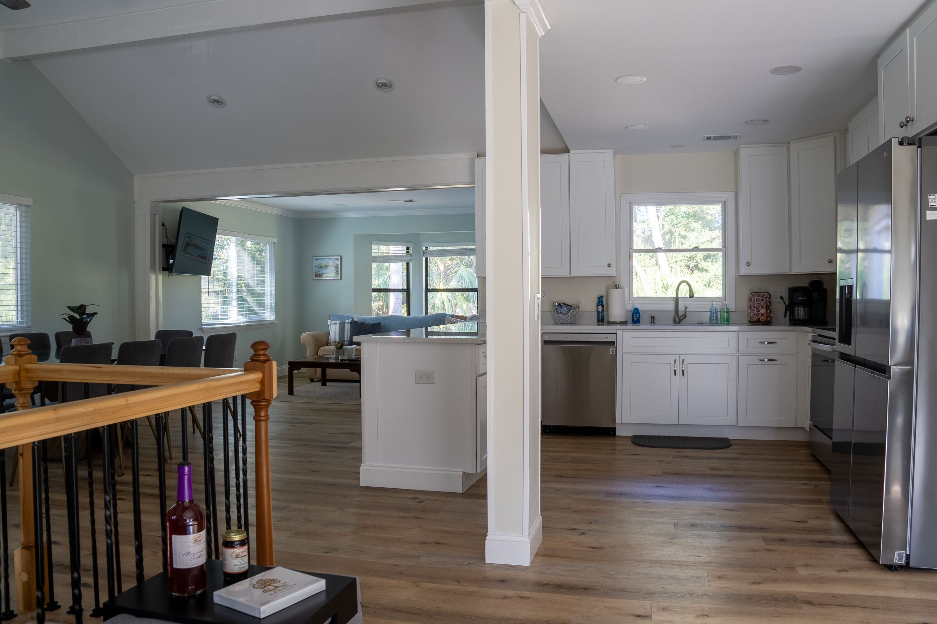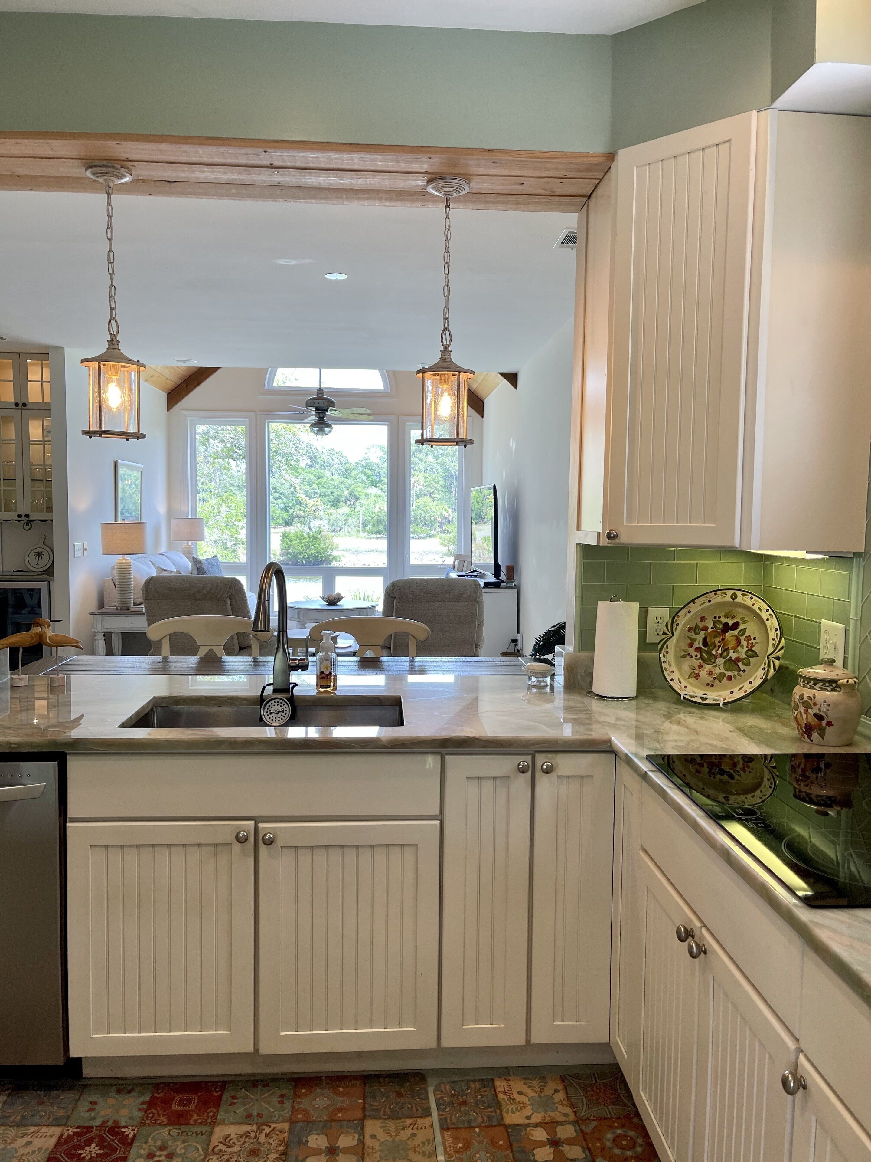 Kitchen has quartz counter tops, bar, newer appliances, and large picture windows for wildlife viewing while preparing a meal. Eat dinner at the large bar height table as you gaze out the large picture windows at the lagoon and passing deer.