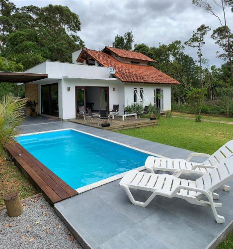 Casa em Garopaba - Piscina - Forno para pizza - Ar condicionado - 3 quartos is located in Garopaba, just 1.2 miles from Garopaba Bus Station and 3.7 miles from Siriu Dunes. This property offers access to a balcony, free private parking, and free Wifi. The vacation home also offers an outdoor swimming pool and a garden for guests to relax in. Providing a terrace and mountain views, the spacious vacation home includes 3 bedrooms, a living room, satellite flat-screen TV, an equipped kitchen, and 3 bathrooms with a walk-in shower. Guests can take in the ambience of the surroundings from an outdoor dining area or keep warm by the fireplace on colder days. The vacation home offers bed linen, towels, and laundry service. During warmer months, you can make use of the barbecue facilities and eat on the private patio. Florianopolis-Hercilio Luz International Airport is 55 miles away.