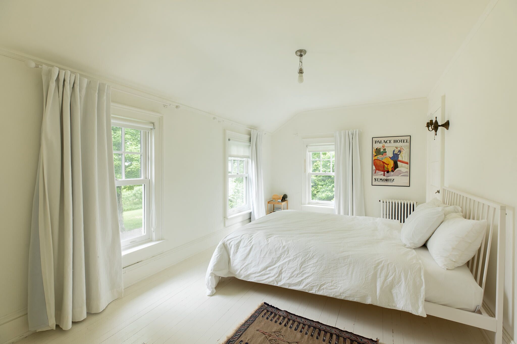 A quaint home that was built in the 1800s and then moved to this quiet spot in Germantown surrounded by orchards. Some of the original wood floorings are still intact. There is a bedroom downstairs with a full-sized bed and separate entrance, an open kitchen, half bath, and a propane stove that doubles as a fireplace to keep the whole house toasty. There is also a great desk area perfect for those working from home. Upstairs there is a grand loft bedroom, with a queen-sized bed, comfy day bed, and ensuite bathroom. Sit outside on the Adirondack chairs or one of the swings. There is even a renovated barn that currently doubles as a yoga studio or work room