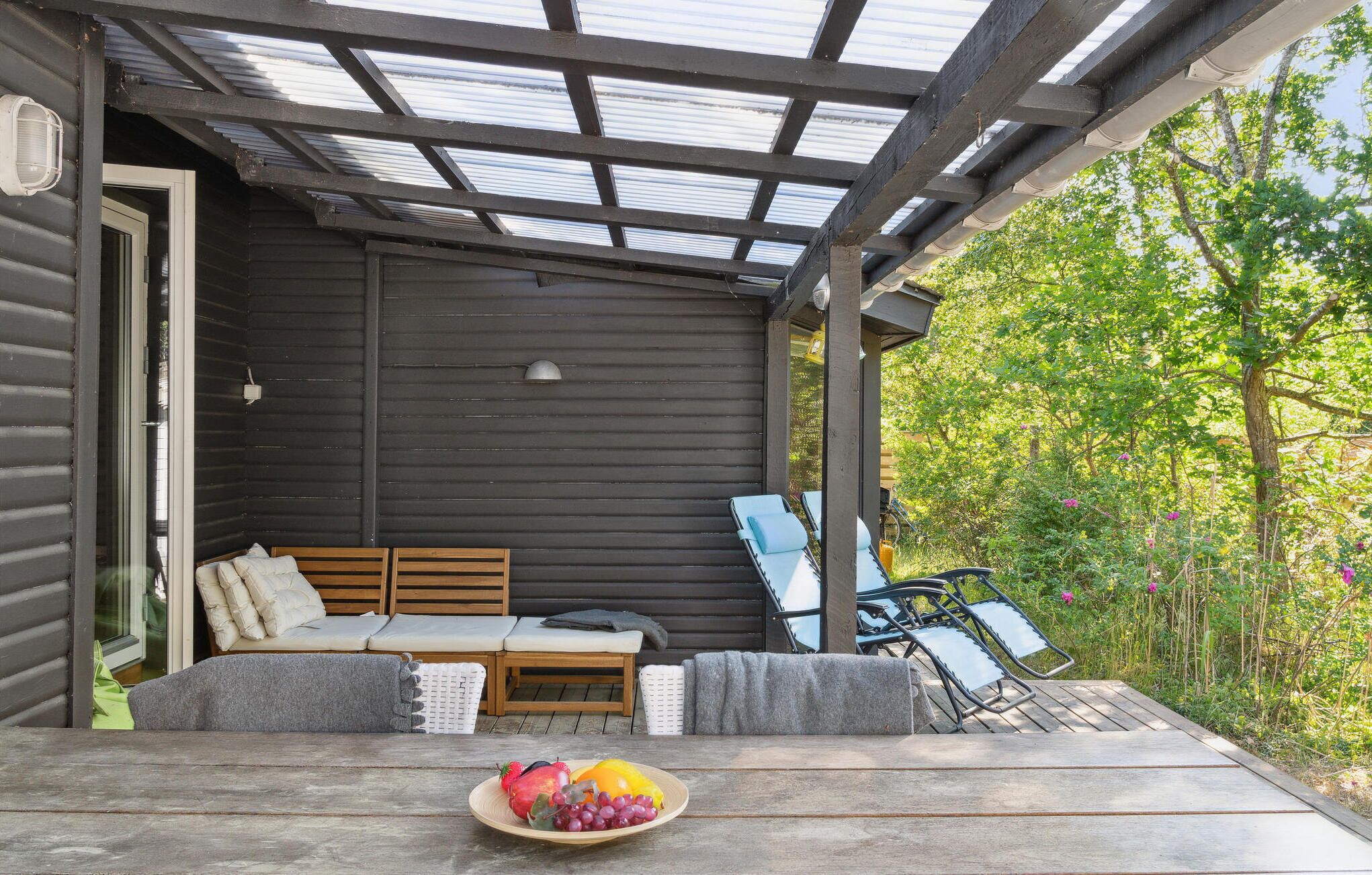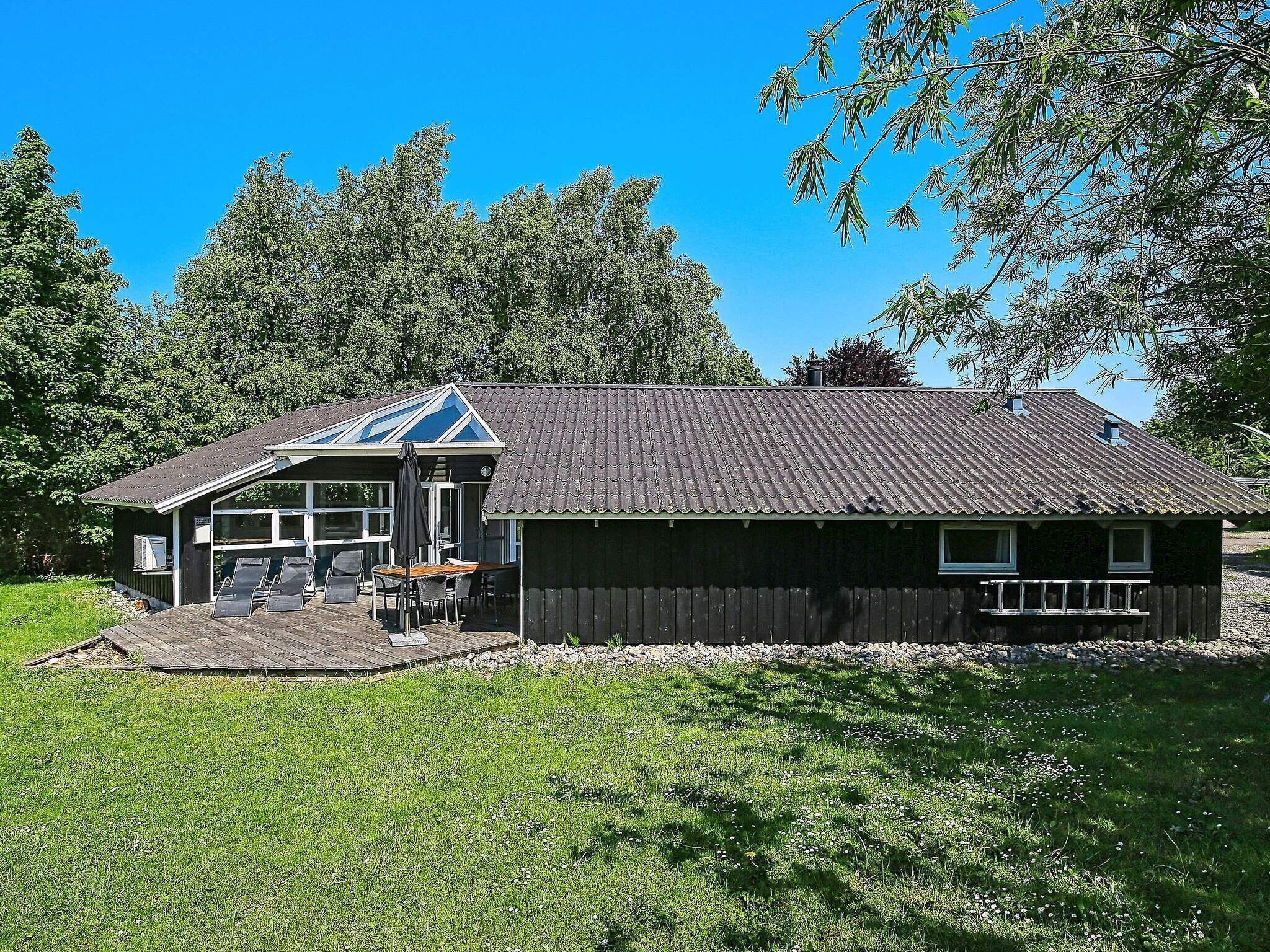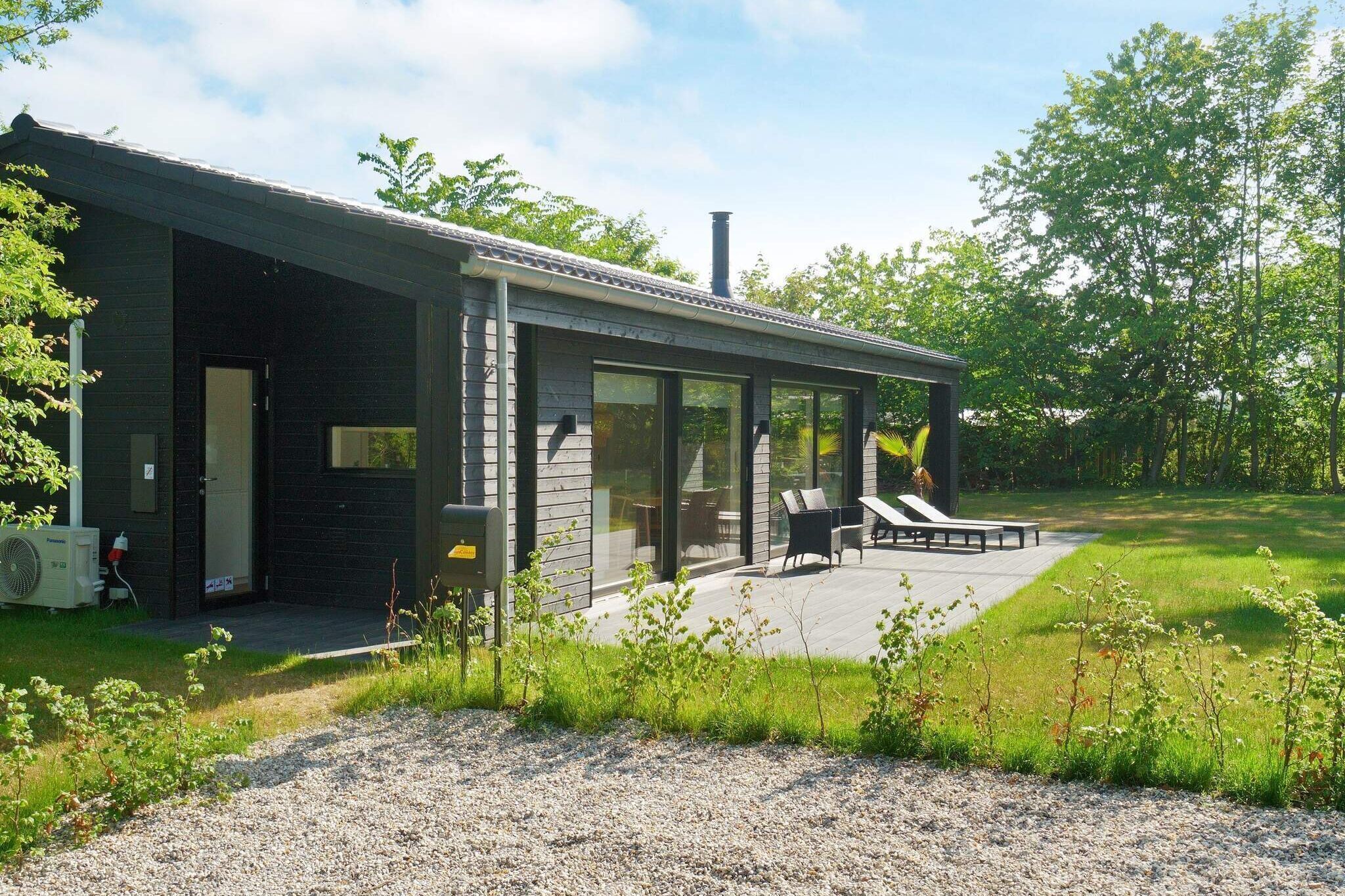 Layout: Kitchen(stove(induction), coffee machine, oven, dishwasher, fridge-freezer), Living/bed room(TV(german television channels, danish TV channels (DR1 and TV2), norvegian TV channels , swedish TV channels), stereo unit, chromecast), bedroom(double bed), bedroom(double bed), bedroom(3x bunk bed), bathroom(floor heating)(washbasin, shower, toilet), bathroom(floor heating)(washbasin, shower, toilet), carport, shower(outside), balcony or terrace, heating(electric), terrace, garden furniture, sun loungers, air to water heatpump