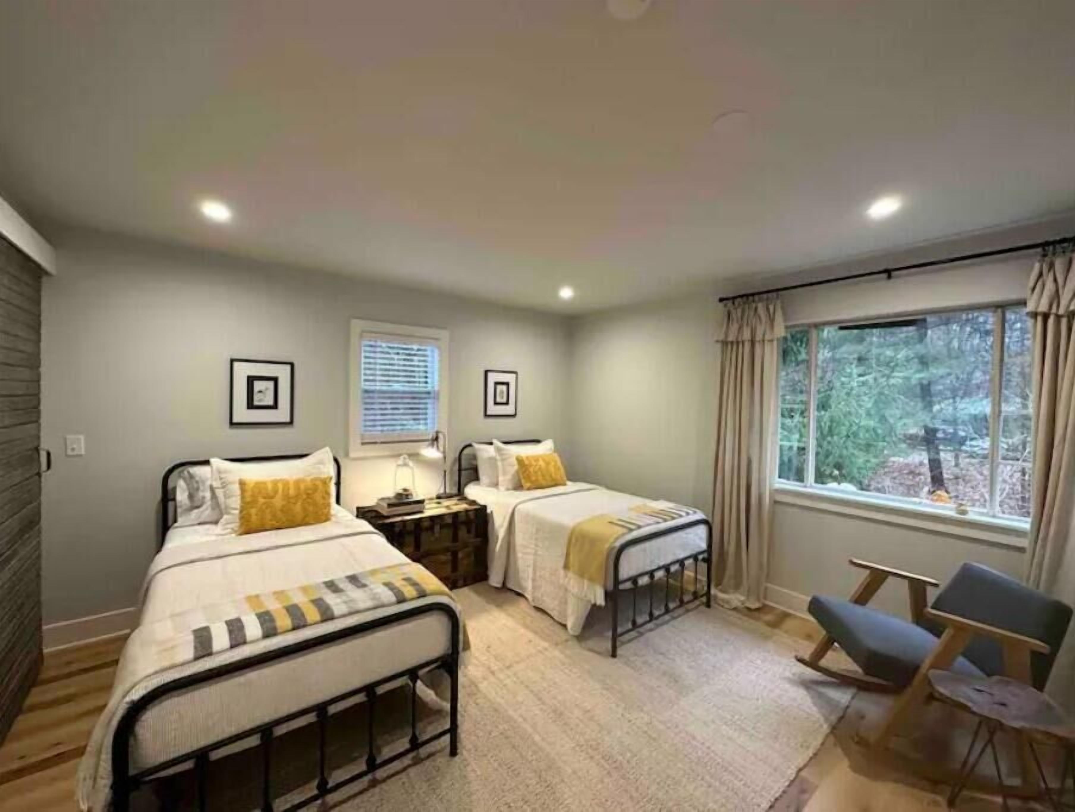 The master bedroom has a King bed, closet and desk. The 2nd bedroom has a 2 twin beds and a closet. There is tons of natural light in this place and beautiful views of the surrounding woods. However you are not so isolated that you can't easily get to the highway.