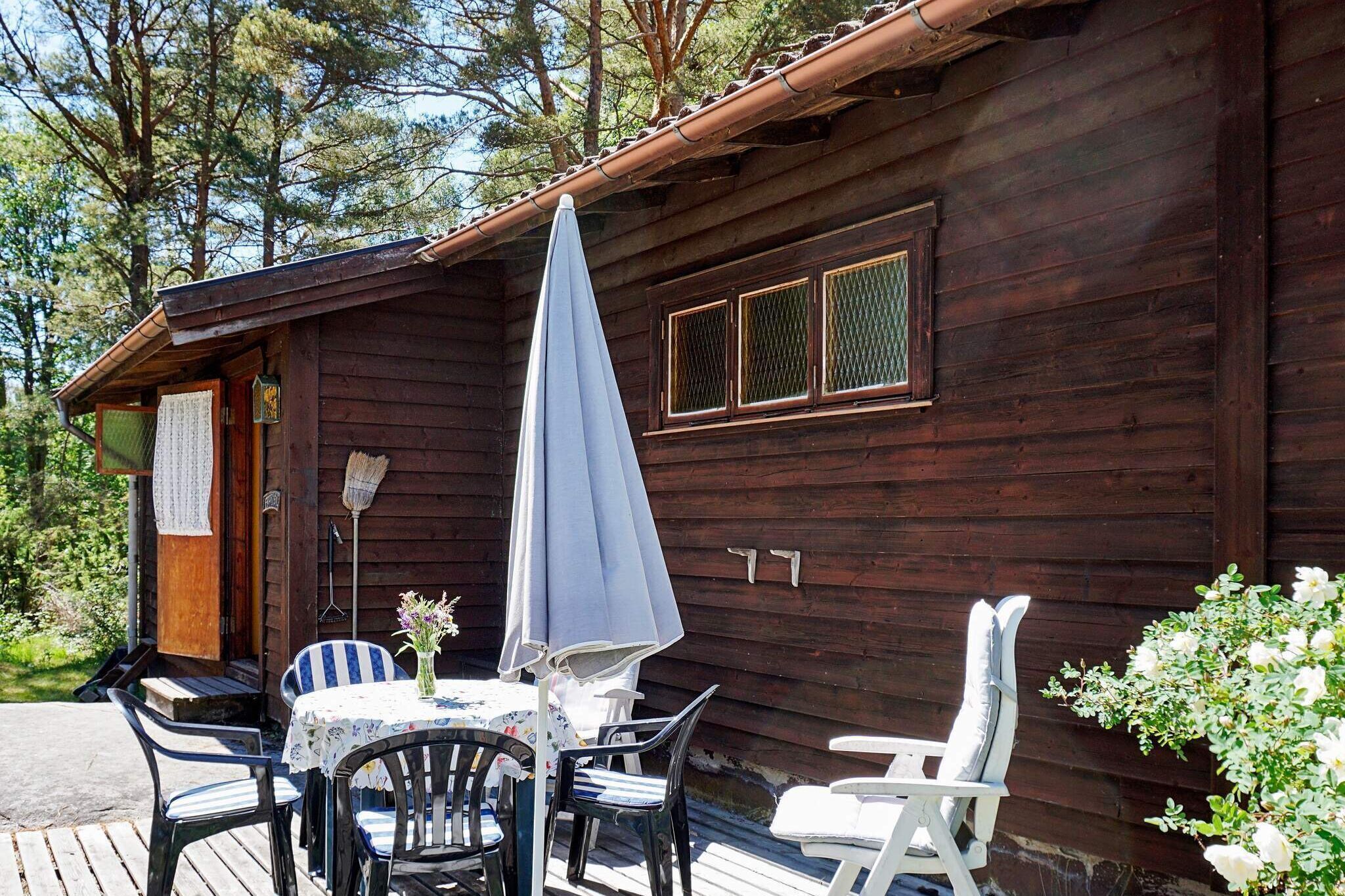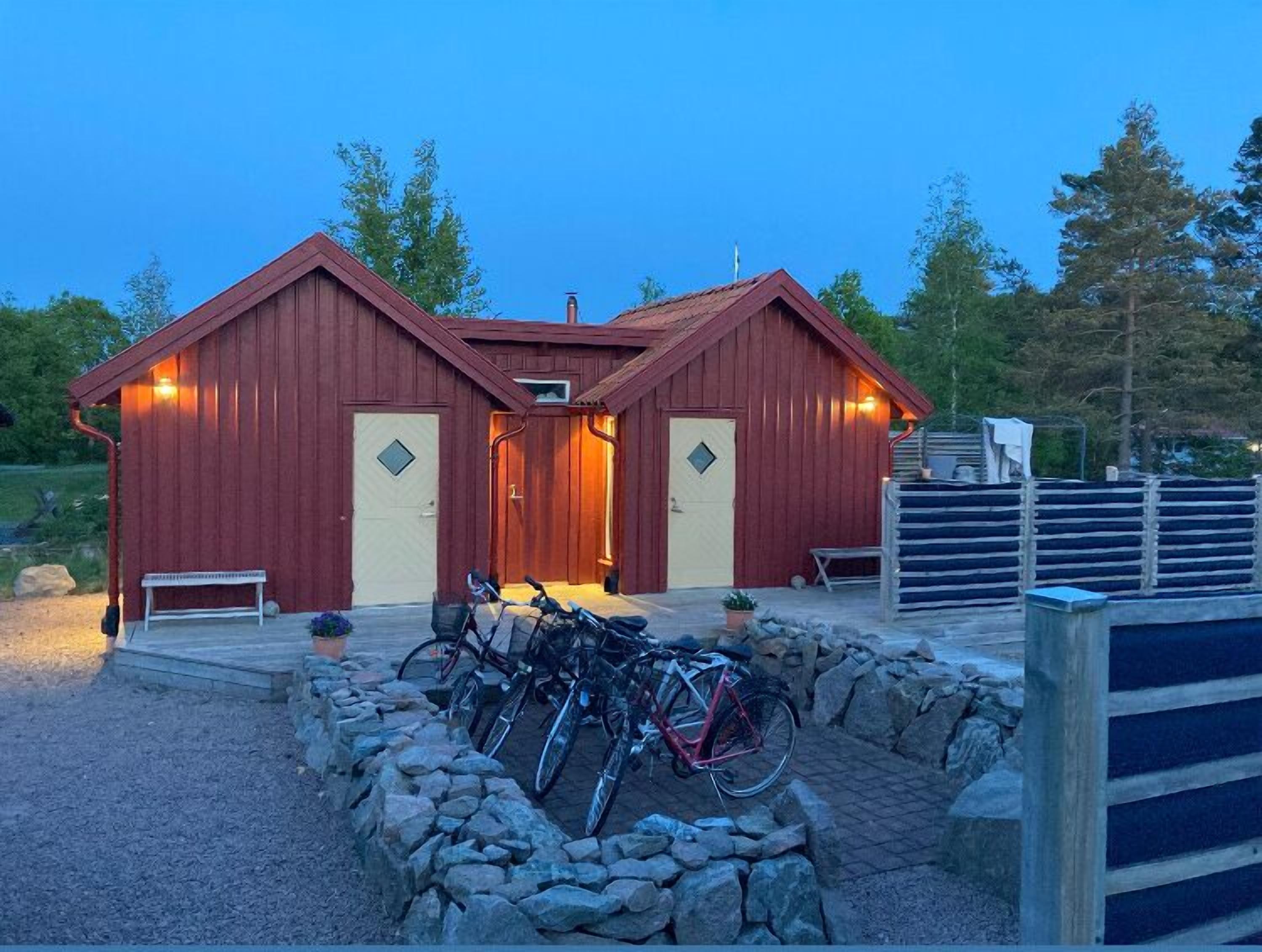 Layout: Kitchen(cooker(electric), hood, coffee machine, microwave, fridge-freezer), Living/bed room(TV(swedish TV channels), fireplace, DVD player, radio, CD player), bedroom(2x single bed), bathroom(washbasin, shower, washing machine), bathroom(washbasin, toilet), 3x single bed, heating(electric), courtyard(garden furniture, BBQ), garden, parking