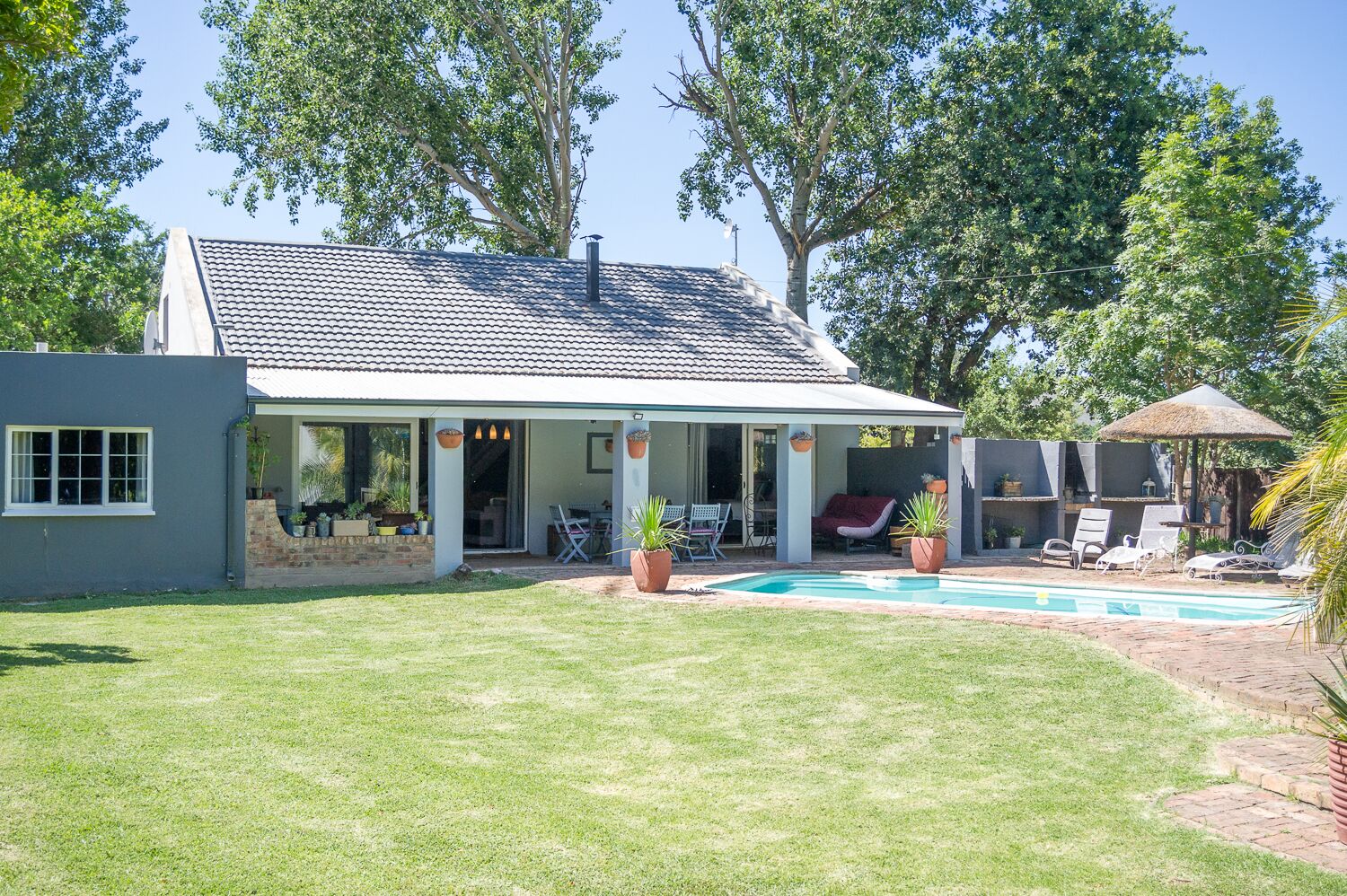 A newly renovated home in the village with three bedrooms, two double volume bedrooms. Full on-suite bathroom, additional bathroom with shower, large wonderful undercover patio with ample space for many guests and entertainment evenings on perfect summer evenings around the pool and outdoor braai area.