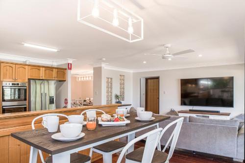 Designed for functional comfort, this stylish and large family holiday home invites you to experience Moore River, with luxury plush beds, a top-notch open kitchen, ample seating on comfy couches, and three expansive decks boasting stunning views.