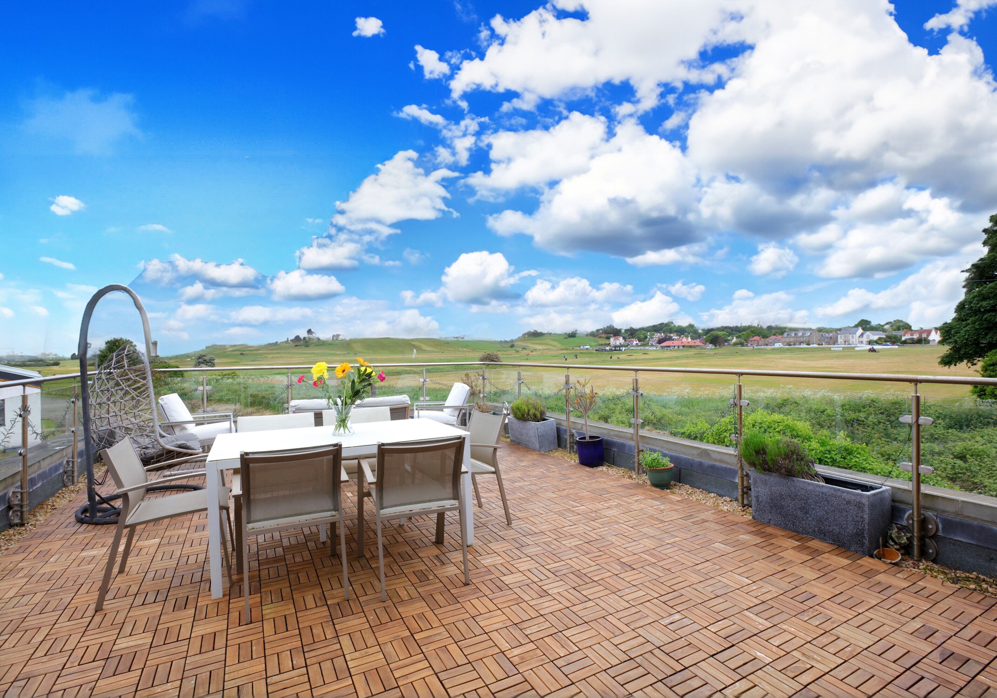 Enjoy the wrap-around balcony with outdoor dining furniture and views over Gullane, as well as the shared garden.