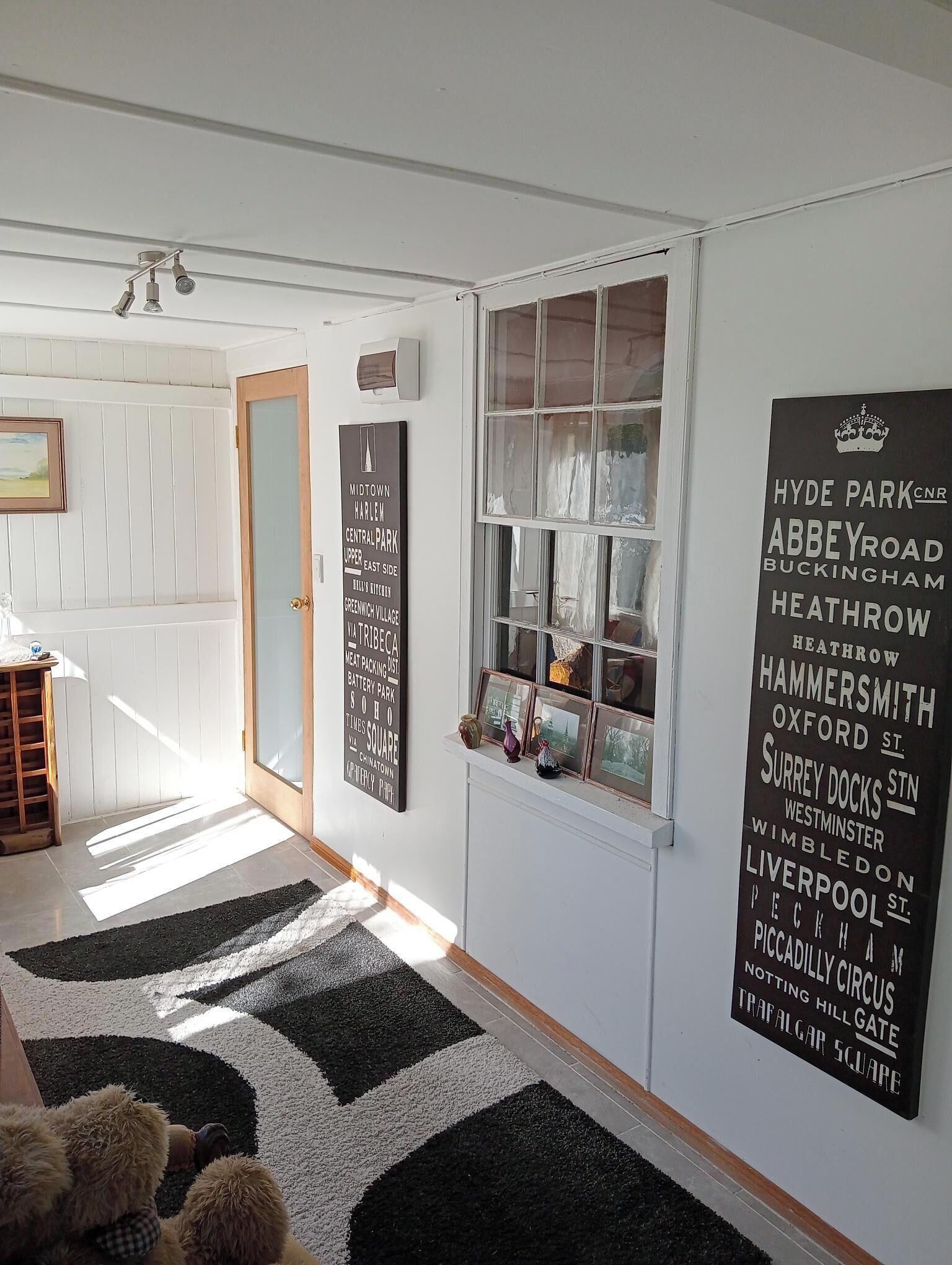 • A sunlit living area with cozy seating, smart TV, and vintage touches
