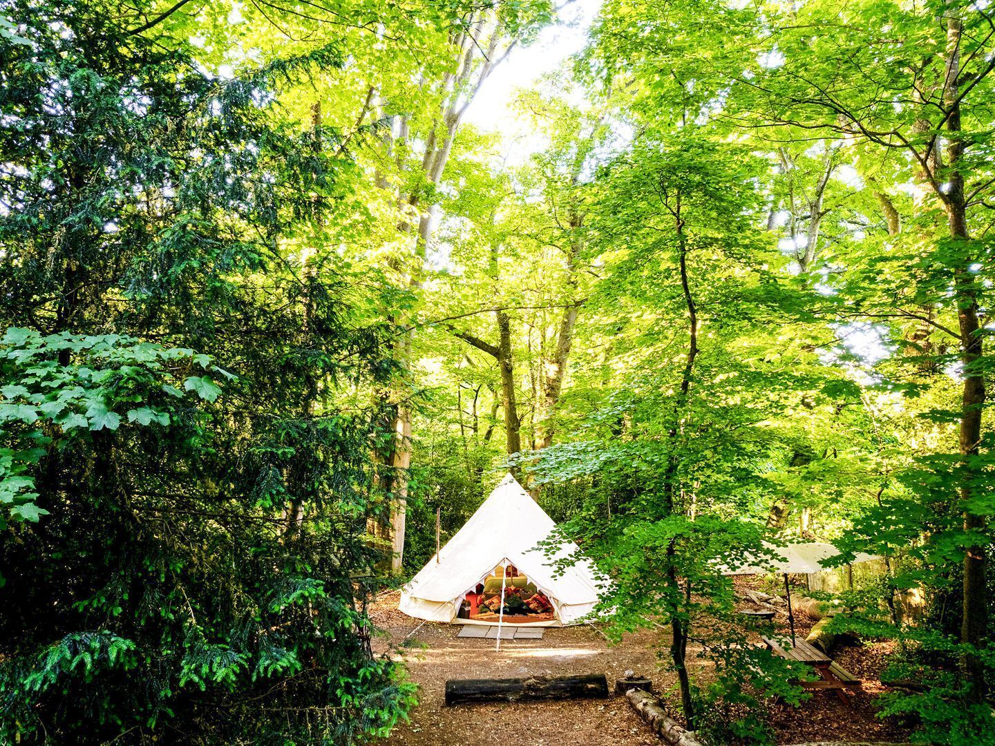 Hidden in a magical woodland clearing near Newbury on the Hampshire–Berkshire border, our off-grid bell tents offer a unique escape for couples, families, dogs and groups.Each huge six-meter bell tent sleeps 2 adults in a double bed, plus up to 4 children on comfy pull-out Z beds. Furnished in a relaxed Bedouin style with rugs, cushions and a cozy log burner, the tent is light and spacious, with a private deck and firepit, and its own bathroom with hot shower and flushing toilet right next door.You'll have everything you need for a comfortable stay: all bedding and towels, a fully equipped cooking station with gas stove and charcoal BBQ, fridge freezer access, crockery and cutlery (including plastic sets for kids), washing-up gear, and even tea, coffee and sugar. The site is off-grid, but fairy lights and lanterns keep things magical – and we'll happily charge your phone if needed.Guests are free to roam our 10-acre private woodland with hidden paths, wood sculptures, a tire swing, and space for den-building. Expect visits from our resident ducks, chickens, geese, peacocks, dogs, and curious cats – plus local wildlife like deer and foxes.There are three great pubs within walking distance – The Rampant Cat, The Highclere Red House, and The Furze Bush – and the village of Woolton Hill has a shop, post office and monthly market. Nearby, explore Highclere Castle (aka Downton Abbey), 4 Kingdoms Adventure Park, local nature reserves, Newbury Racecourse, canal boats and scenic walking trails.We've kept the glamping vibe real – it's all about fresh air, campfires and connection – but without sacrificing the comforts that make it special. And for groups, we have five tents on site – just ask about our group discounts.Please note:We don't supply wood, charcoal or tealights, so bring your own. The site is off-grid and animals roam freely – if that's not your thing, this may not be your spot!
