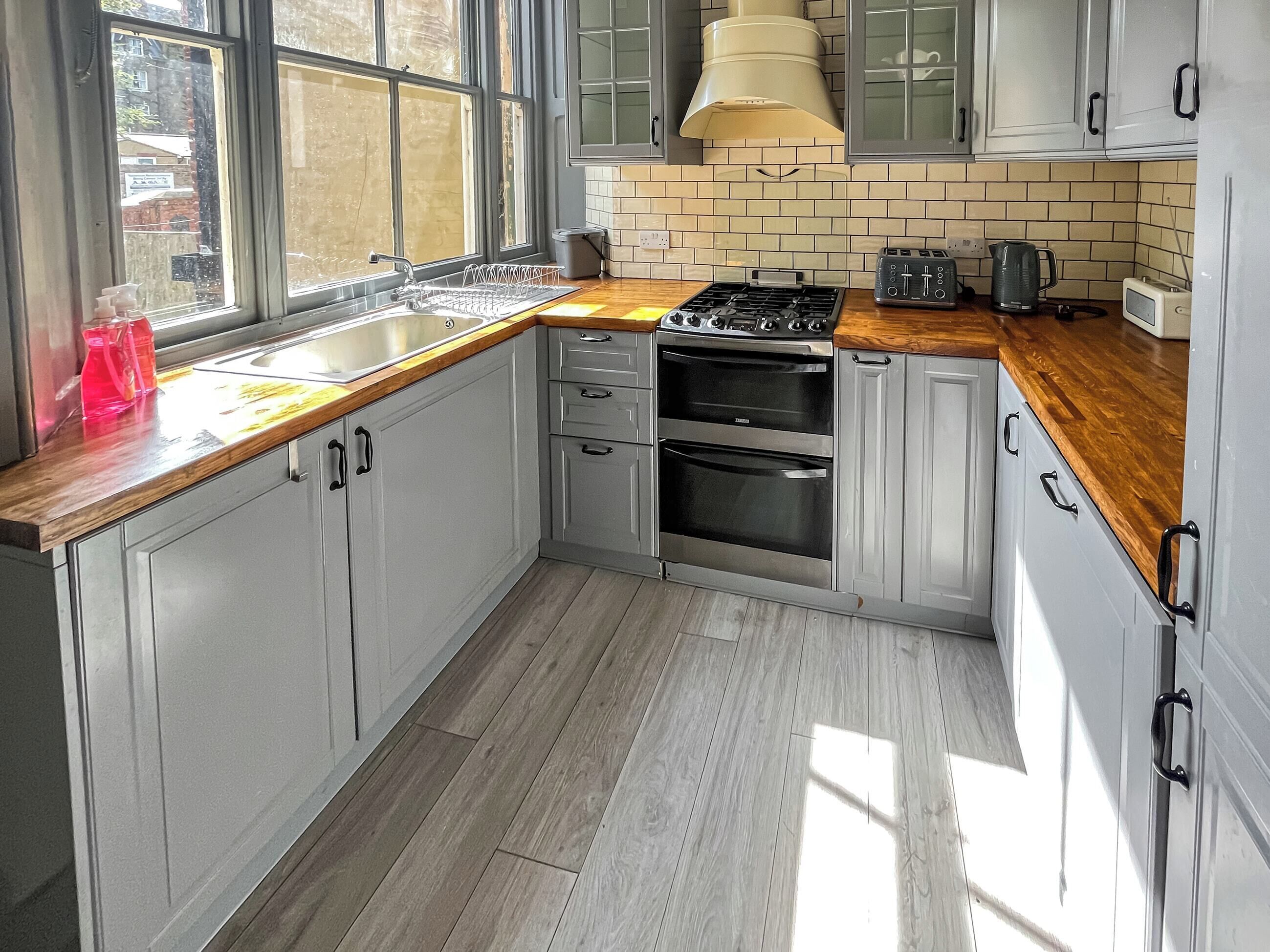 Fully refurbished barn, done to a very high standard this colourful, modern barn provides a home away from home, surrounded by stunning gardens. Downstairs there is a fully fitted kitchen with hob and oven as well as a fridge. A dining table doubles as a home office space, whilst in the living space the L shaped sofa and 65" TV allow for relaxing in front of Prime Video and Netflix, Disney.