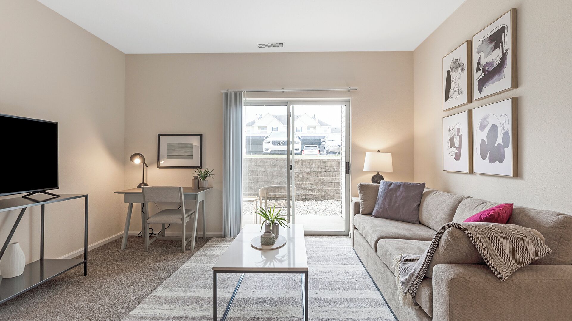 INDOOR LIVING: Flat-screen TVs, 4-person dining table
