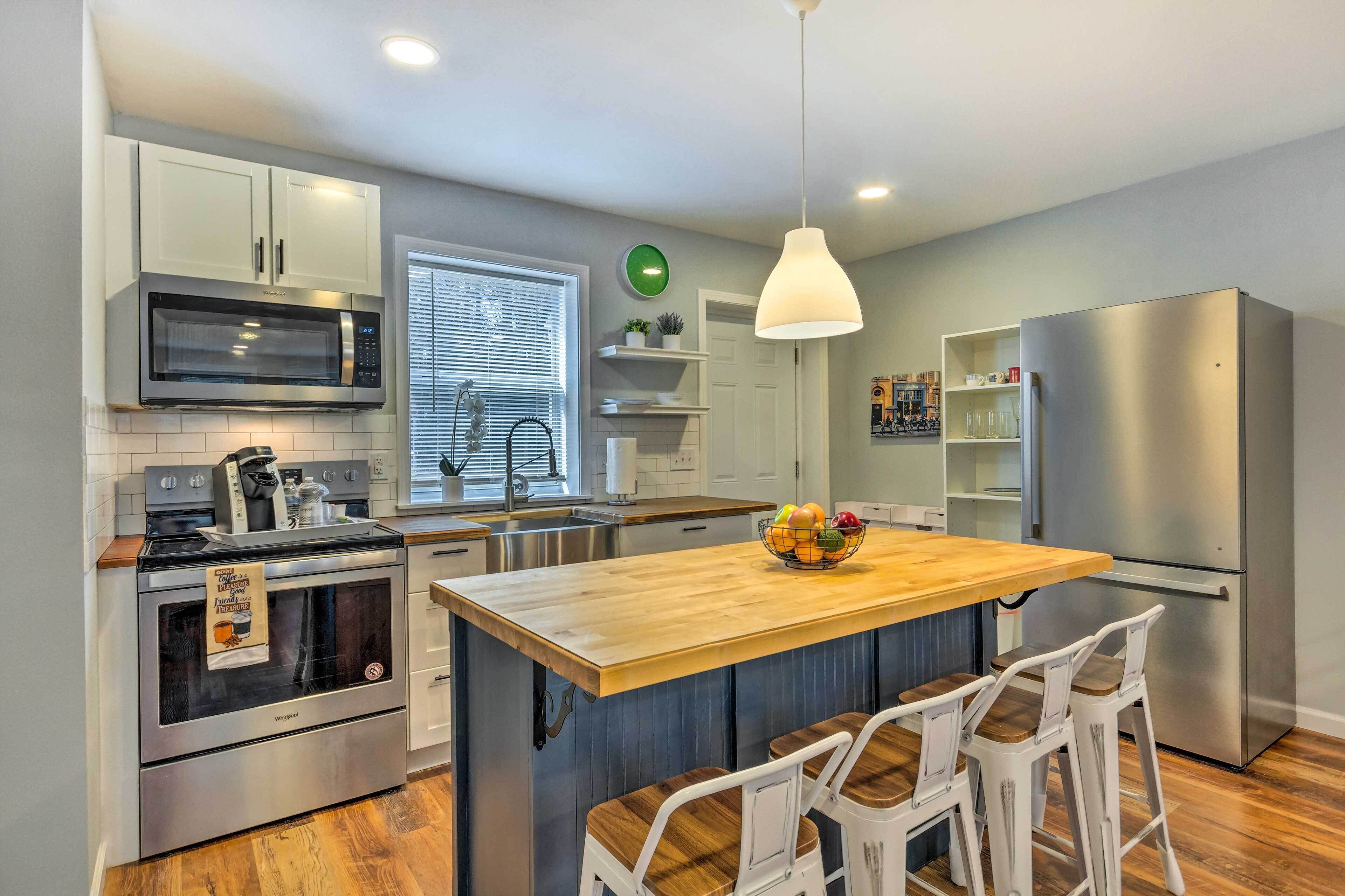 The open-concept kitchen, dining, and living space makes it easy to gather and connect. The kitchen is fully stocked with cookwares and includes brand new appliances—stove, dishwasher, washer, and dryer—for everything from easy meals to post-beach laundry. The large dining table seats 9, and the kitchen counter and breakfast nook add 6 more seats, so everyone has a place to share meals together.