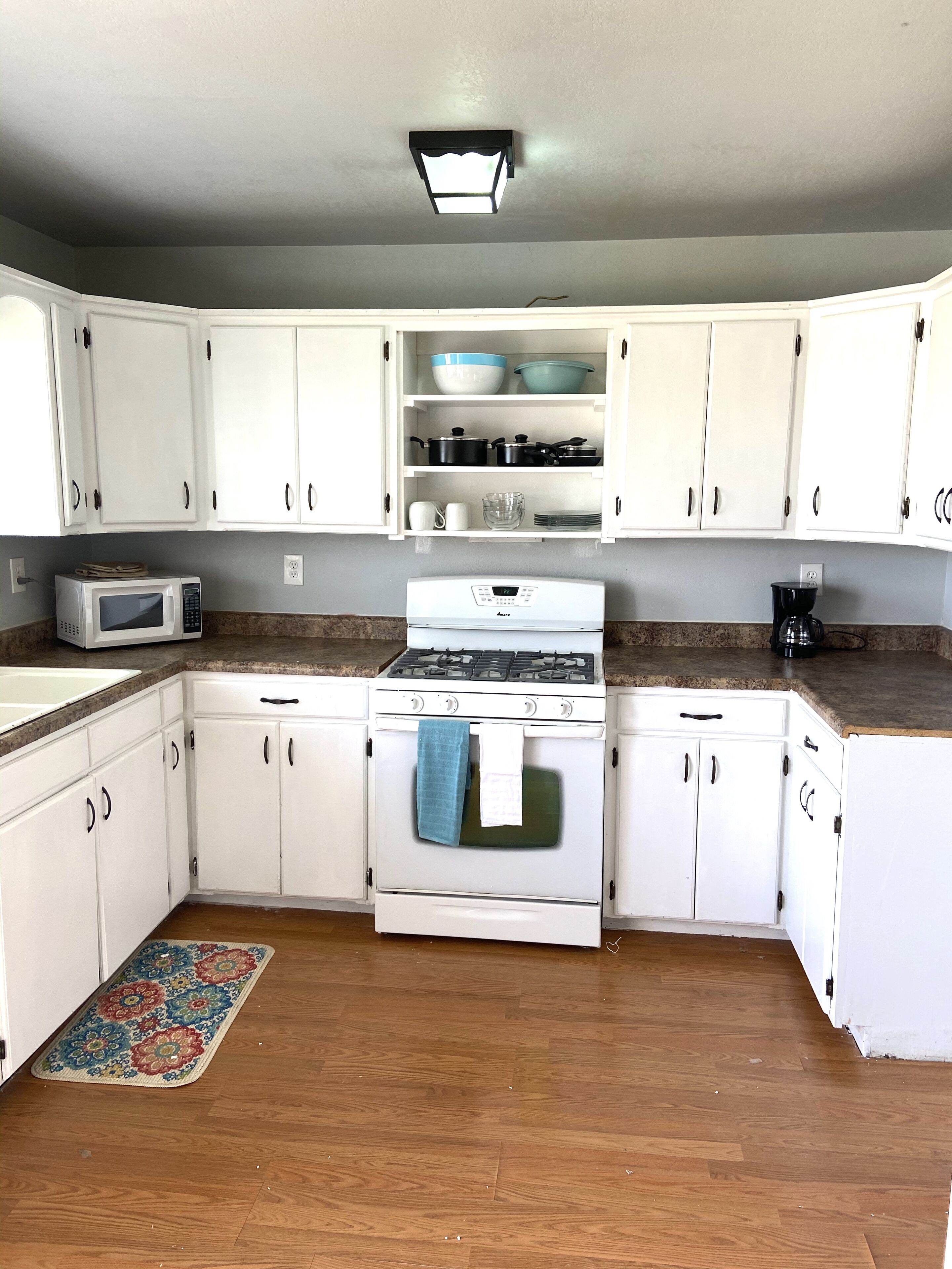 Fully Equipped Kitchen with microwave, oven, dishwasher, cookware, dishes, utensils, and kitchen tools.