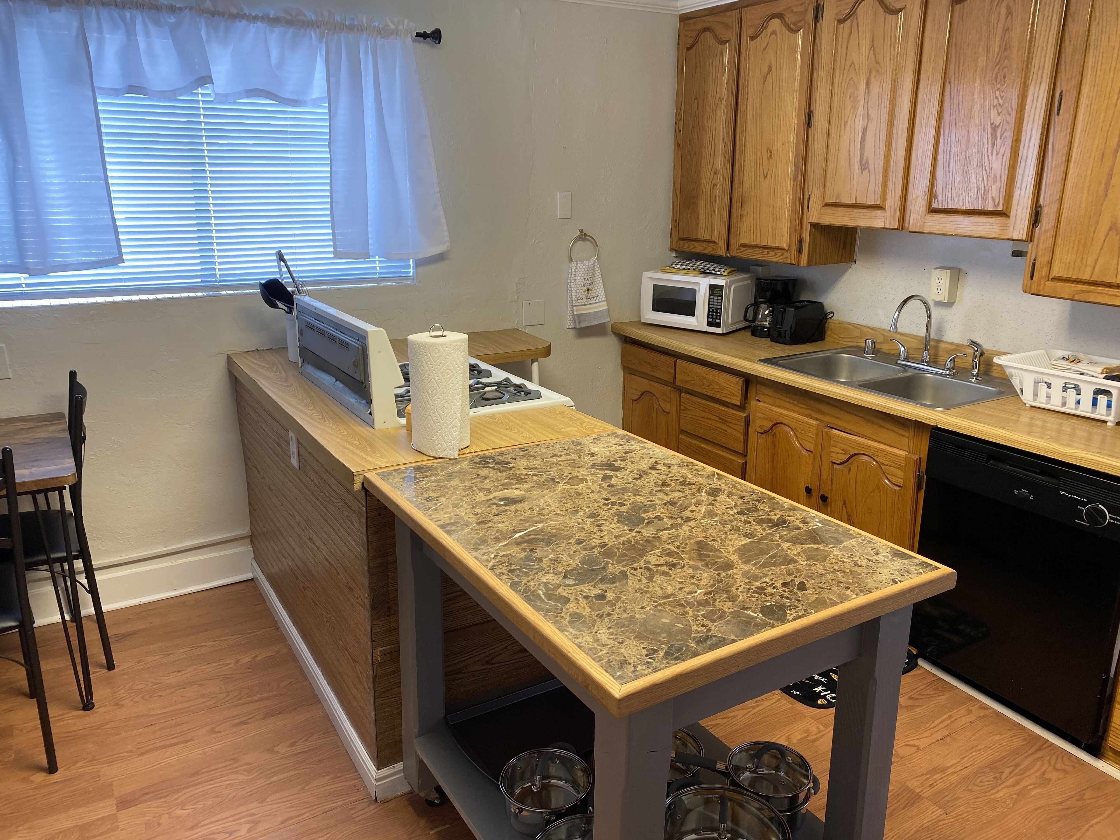 KITCHEN: Fridge, stove, oven, dishwasher, microwave, cooking basics, spices, toaster, coffee maker, island w/ seating, dishware/flatware, paper towels/trash bags