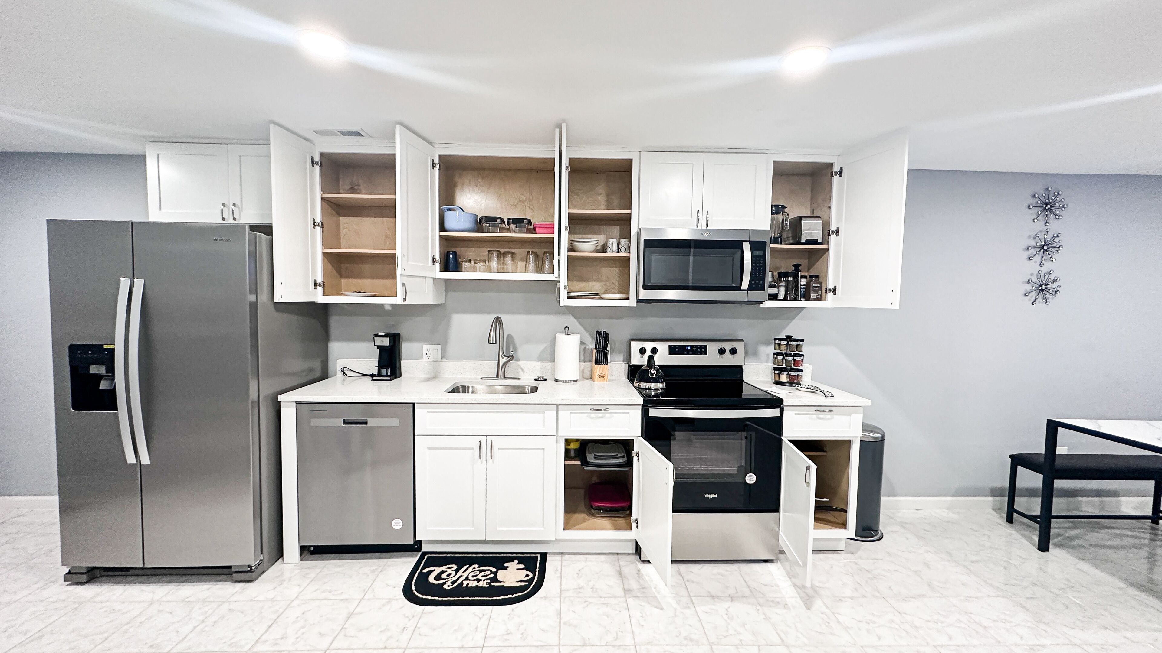 KITCHEN: Fridge, stove, oven, dishwasher, microwave, cooking basics, toaster, Keurig coffee maker, paper towels/trash bags