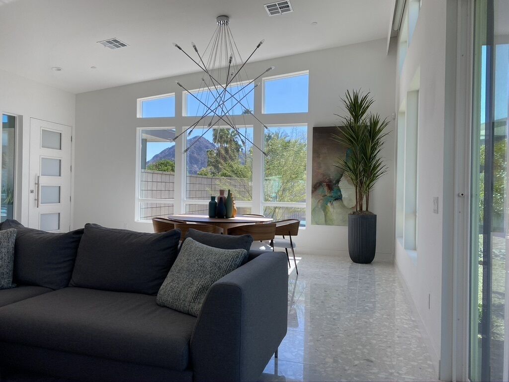 I cannot say enough about this beautiful home. The cool, hip vibe is felt throughout without seeming cold. It is radiant, yet warm and comfortable inside and out. The kitchen has everything you could wish for and is ideal for entertaining. Every piece of furniture is quality and was chosen with comfort and beauty in mind. The home has tile floors throughout with the exception of the primary suite which has new, plush carpet. There is also a scattering of area rugs for comfort. All rooms are light, sunny and bright with high ceilings, lots of windows bringing in natural light and the home has that squeaky clean feeling. The home is located in a quiet, high-end neighborhood with easy access to HWY111, El Paseo and La Quinta. It is truly a dream of a vacation home. You will love this home “To the Moon and Back!”