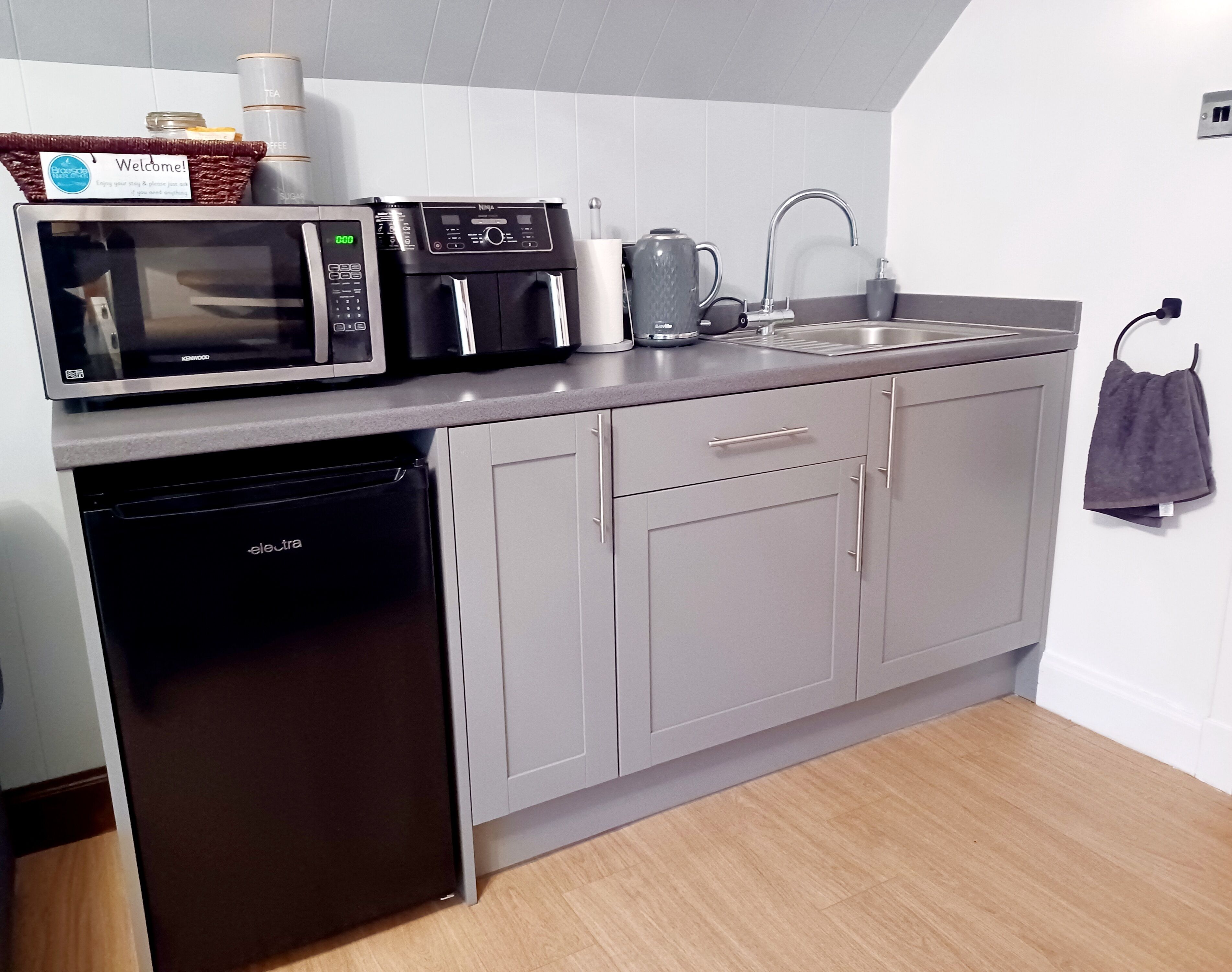 The kitchen has a fridge, an air fryer, an oven, a kettle, a toaster and a microwave.