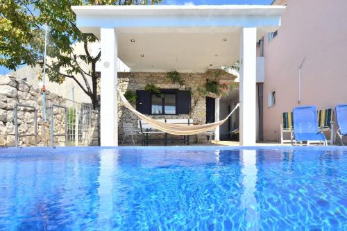 Semi-detached house "Villa Nareste", 3 storeys, renovated in 2017. In the hamlet Krug 1 km from the centre of Jesenice, 9 km from the centre of Omiš, in a quiet, sunny position, 2.5 km from the sea, 2.5 km from the beach. Private: property 450 m2, swimming pool angular, heated (8 x 4 m, depth 75 - 160 cm, seasonal availability: 01.May. - 15.Oct.) with internal staircase. Outdoor shower, pergola, terrace (25 m2), garden furniture. In the house: internet access, washing machine, tumble dryer. Parking (for 4 cars) at the house on the premises. Shop 2.3 km, restaurant 1 km, bus stop 3.6 km, pebble beach 2.5 km, rocky beach 2.5 km. By groups of young people double deposit is requested on arrival.