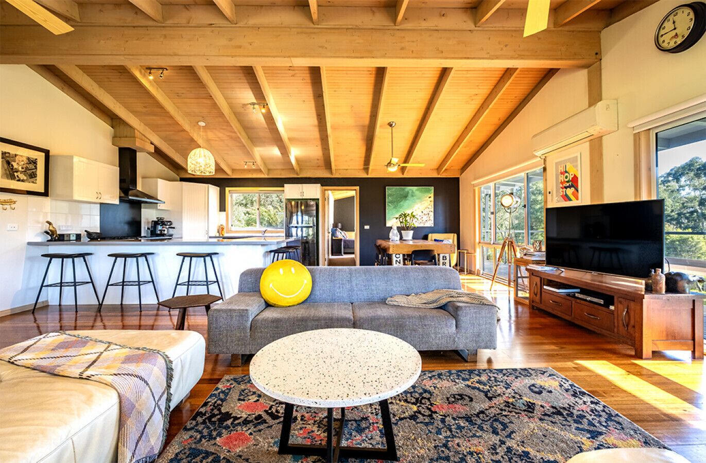 An embodiment of style and functionality, the home is spaciously designed with whitewashed timber cathedral ceilings and Victorian Ash hardwood floors. Walls of windows encircle the open-plan living, dining, and kitchen area, bathing the interiors with sunlight and opening up to the balcony via double sliders. The kitchen is as impressive as it is functional, featuring a top-of-the-line Falcon Classic 1100mm dual fuel cooker and all guests need to cook their own meals in the space. For culinary enthusiasts, the fully-equipped kitchen with modern appliances and a handy coffee machine provides everything you need to whip up delectable meals. The open-plan living area, complemented by a cozy fireplace, is the perfect space for bonding over heartwarming conversations and creating cherished memories.
