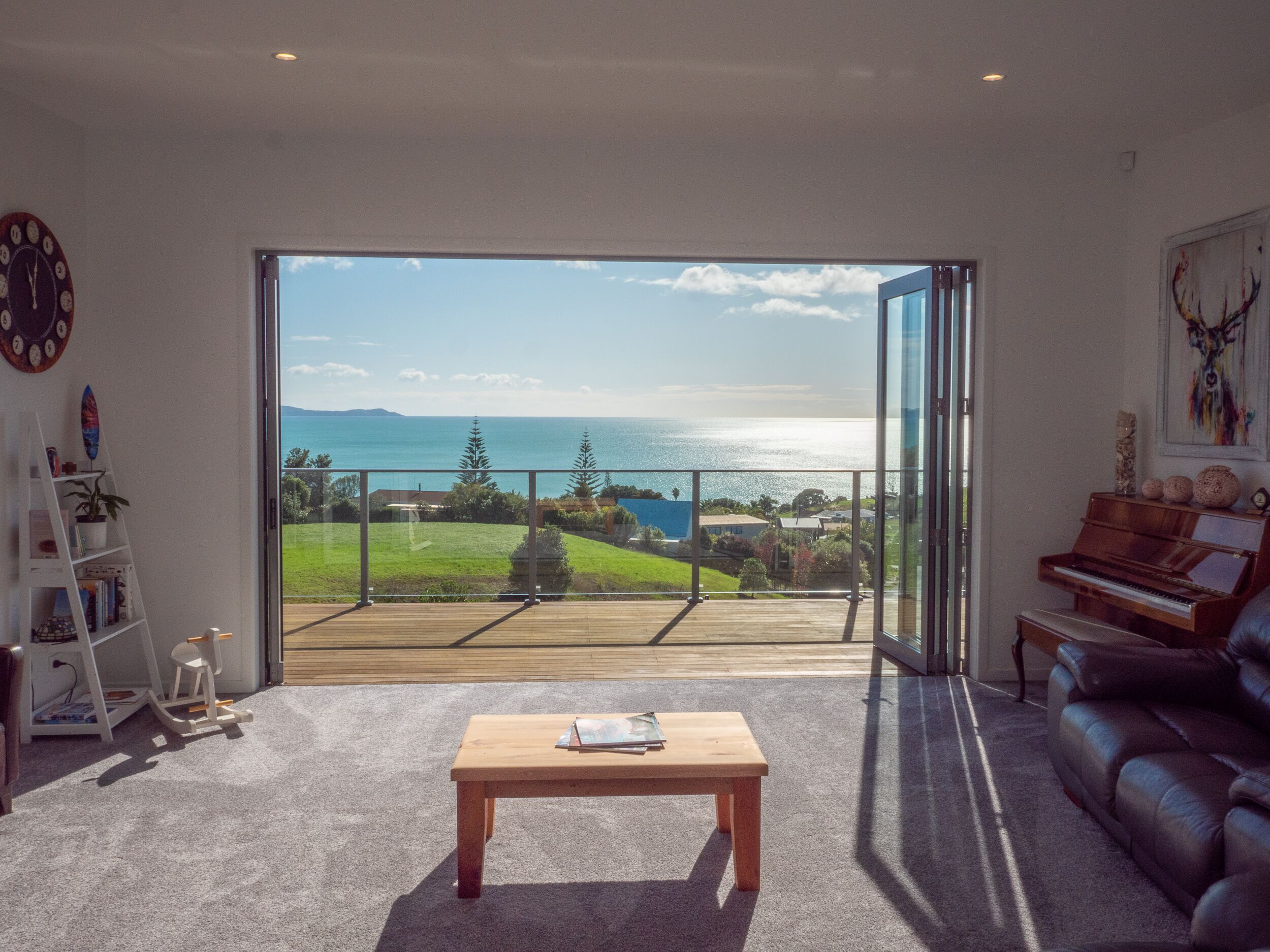 Two large corner stacker doors from the kitchen and dining area open to the large covered outdoor area. Opening both doors allows for unobstructed views of the Tasman sea.