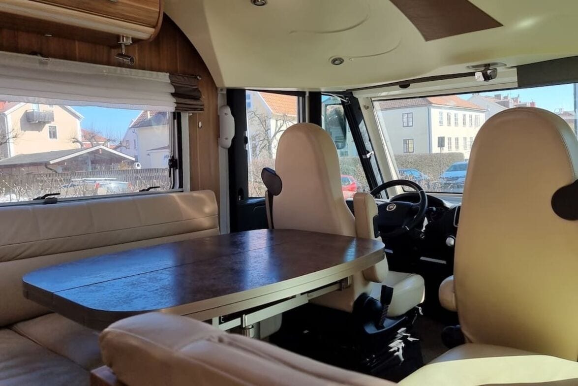 The mobile home is equipped with 4 beds, a smaller child can sleep between the beds in the back, so we have done. Toilet and separate shower. swivel front seats, big tv for being a camper. All seats are in leather.