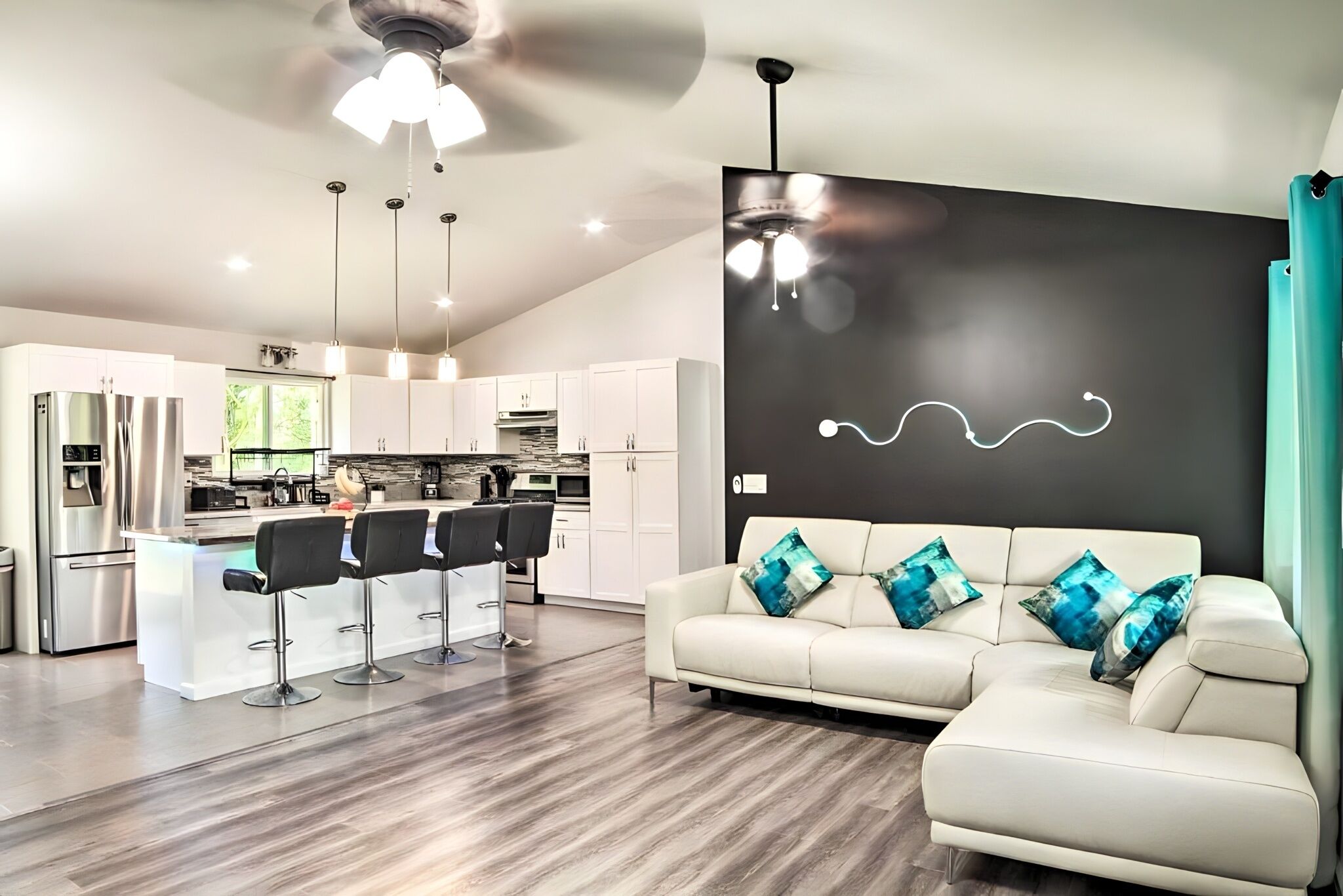 This house is the perfect setup for families to enjoy. As you enter the front door, a large open living room looks out to the big front yard. Equipped with furniture for relaxing and a 48 inch TV for streaming on Netflix, Disney +, Hulu, and Spetrum cable. Enjoy the cool comfort of a split air conditioning system that cools the entire house.