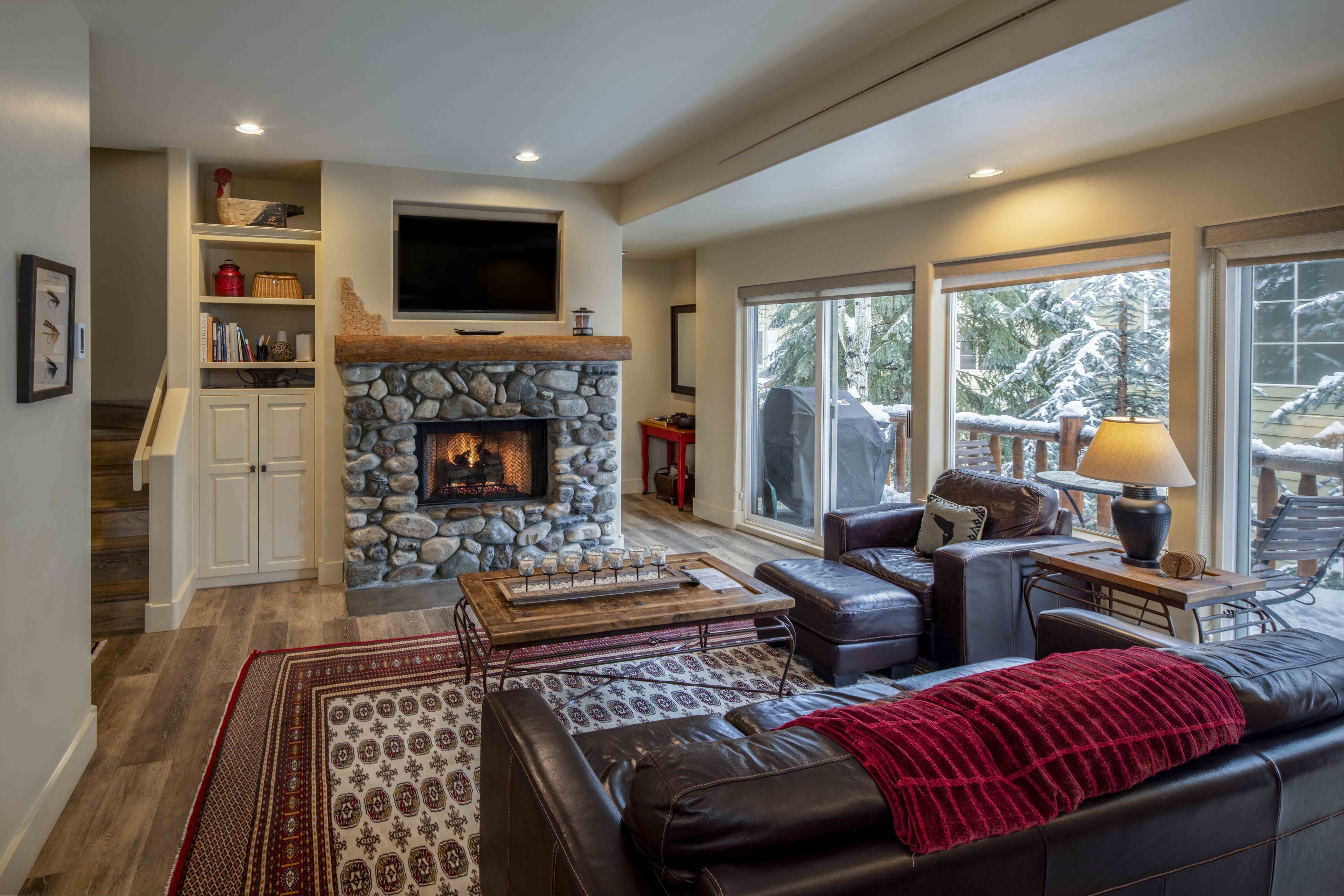 Combining warmth and functionality, the living room invites you to unwind by the fireplace after a day on the slopes or enjoy a summer evening on the deck.