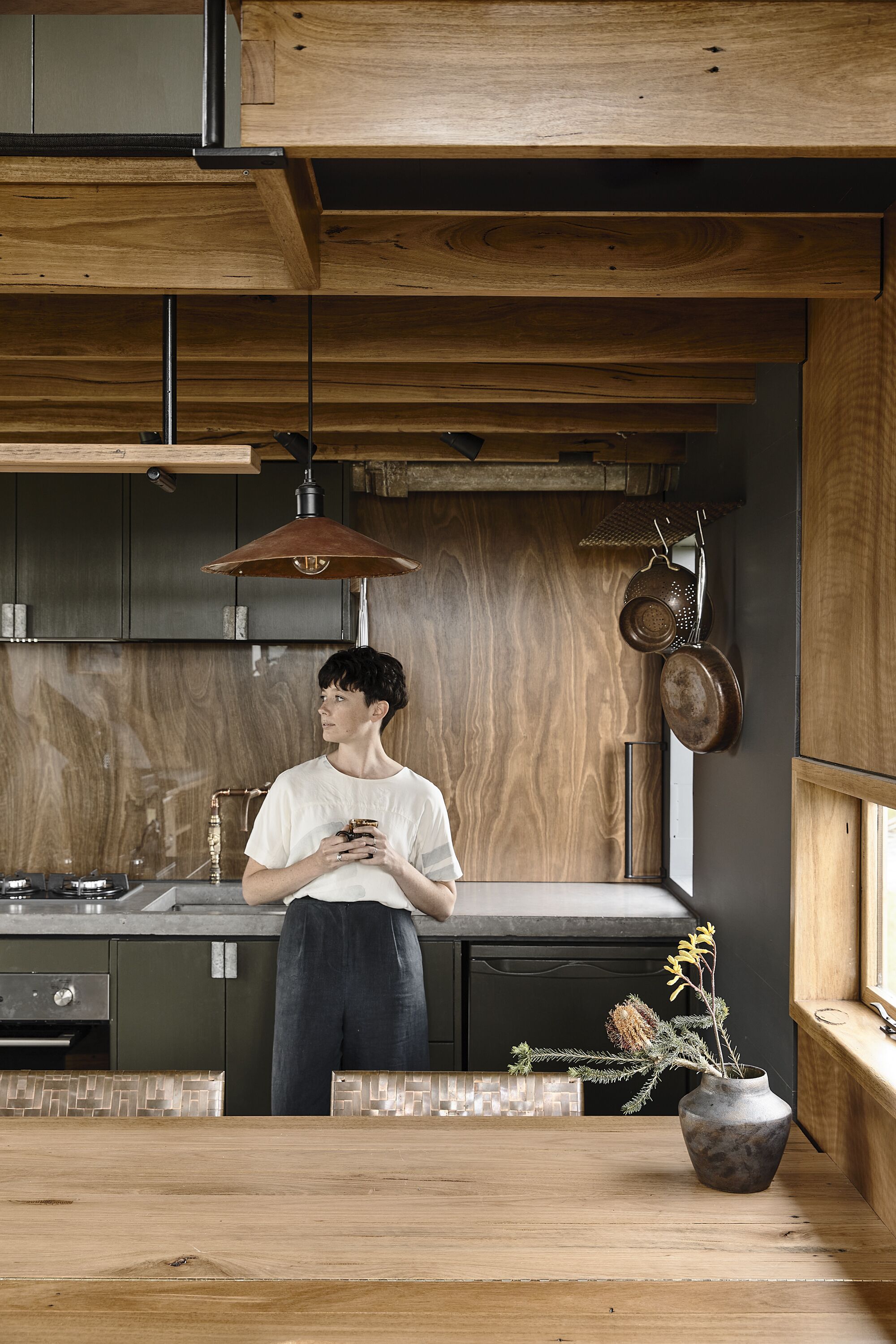 An exploration of maximum volume with a minimum footprint - the space offers bright and spacious living and dining areas with woodfire heating and a luxurious bluestone bathroom. The dreamy upstairs floor has all the requirements for your reading, studying, and resting. Featuring a light filled workspace overlooking the living area and a cosy private bedroom space with hanging storage and drawers so you can really settle in to life in space.