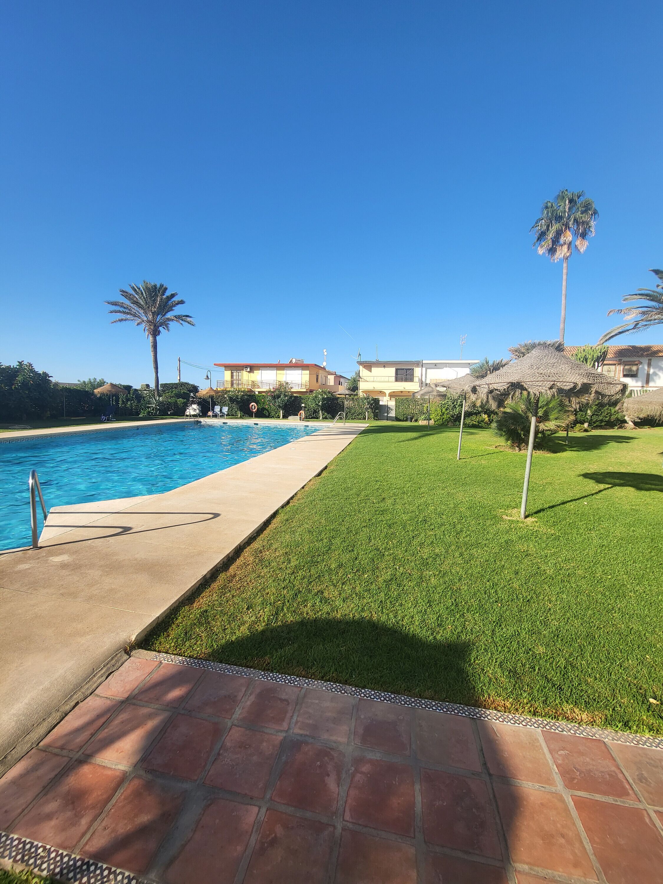 Very beautiful, cosy apartment block "Terrazas Calamijas". In the district La Cala de Mijas, in a quiet, sunny position, 900 m from the sea, south-east facing position. For shared use: garden, swimming pool kidney-shaped (7 x 20 m, depth 140 - 140 cm, seasonal availability: 15.May. - 15.Sep.). Children's pool, outdoor shower. Stepped path (30 steps) to the house. Parking space n 236. Shop 400 m, supermarket, restaurant, bar 300 m, bakery 150 m, café 300 m, sandy beach 900 m. Neighbourhood highly sensitive to noise. Quietness and good behaviour expected. There is one padel court in the complex.