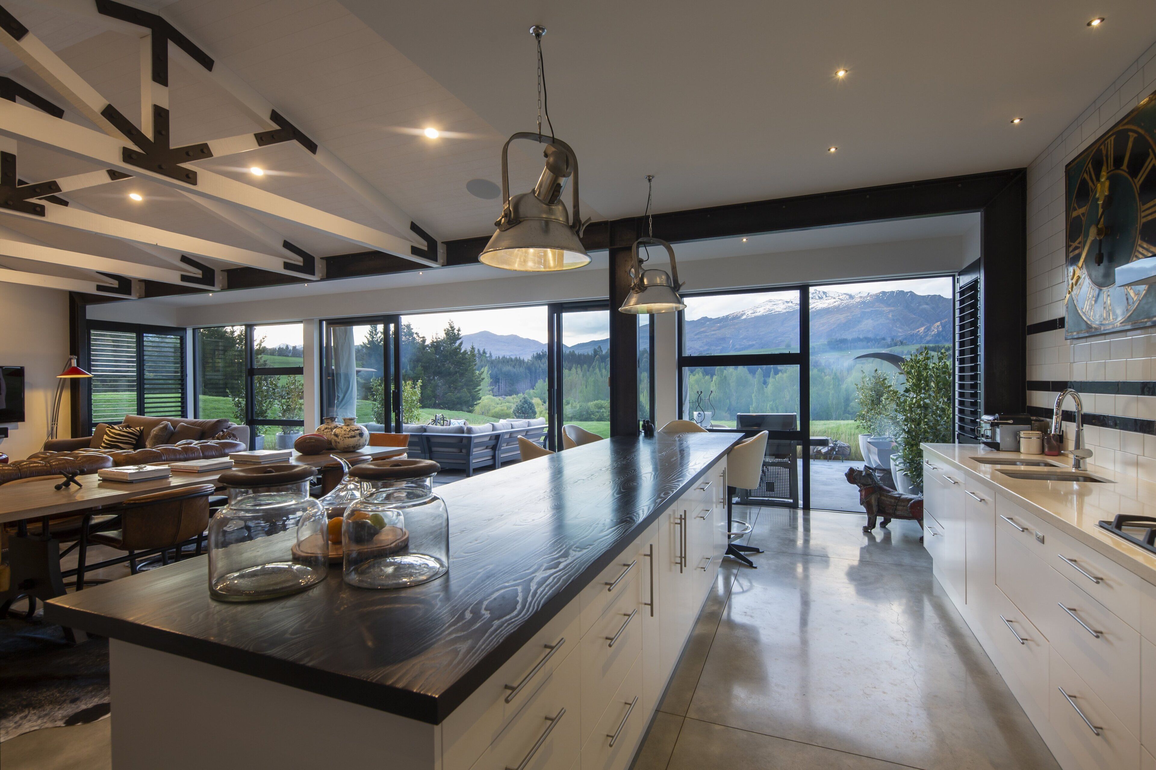 The main level features an open plan living and dining space, fully equipped modern kitchen and views towards Coronet peak.