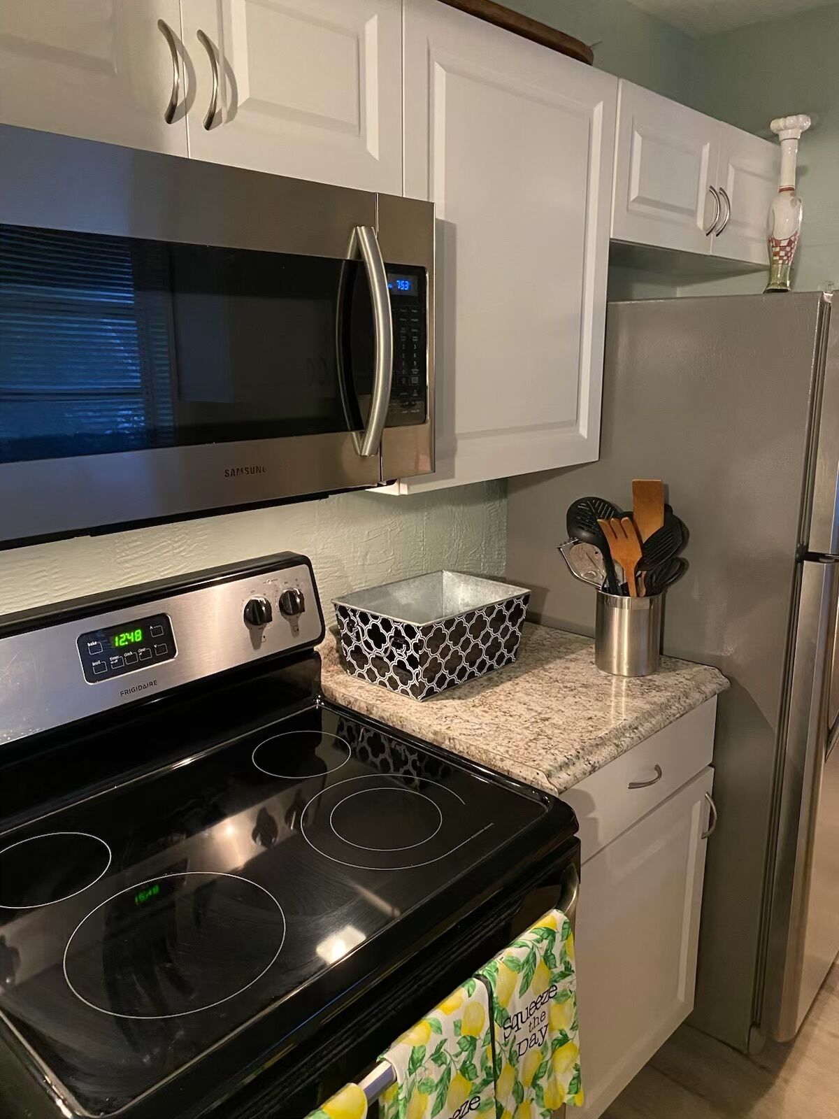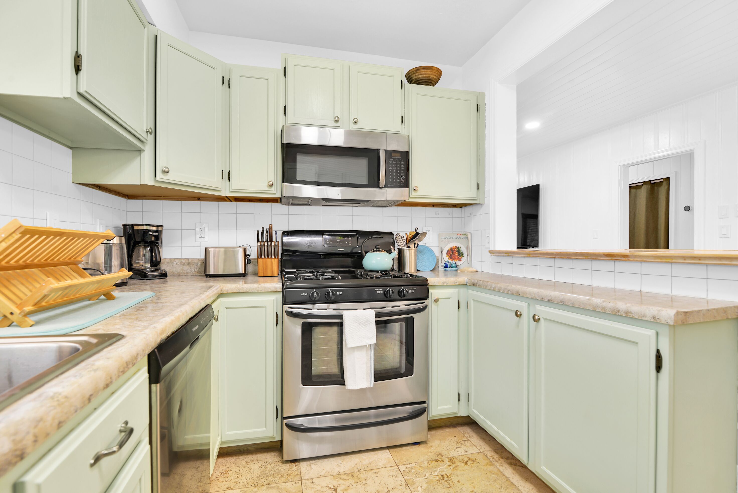 The kitchen has a full size refrigerator, toaster oven, microwave, 4 burner stove with large oven. Coffee maker with single serving and drip pot. A full compliment of kitchen utensils, china and cutlery round out the amenities. Makes this an awesome chill spot.