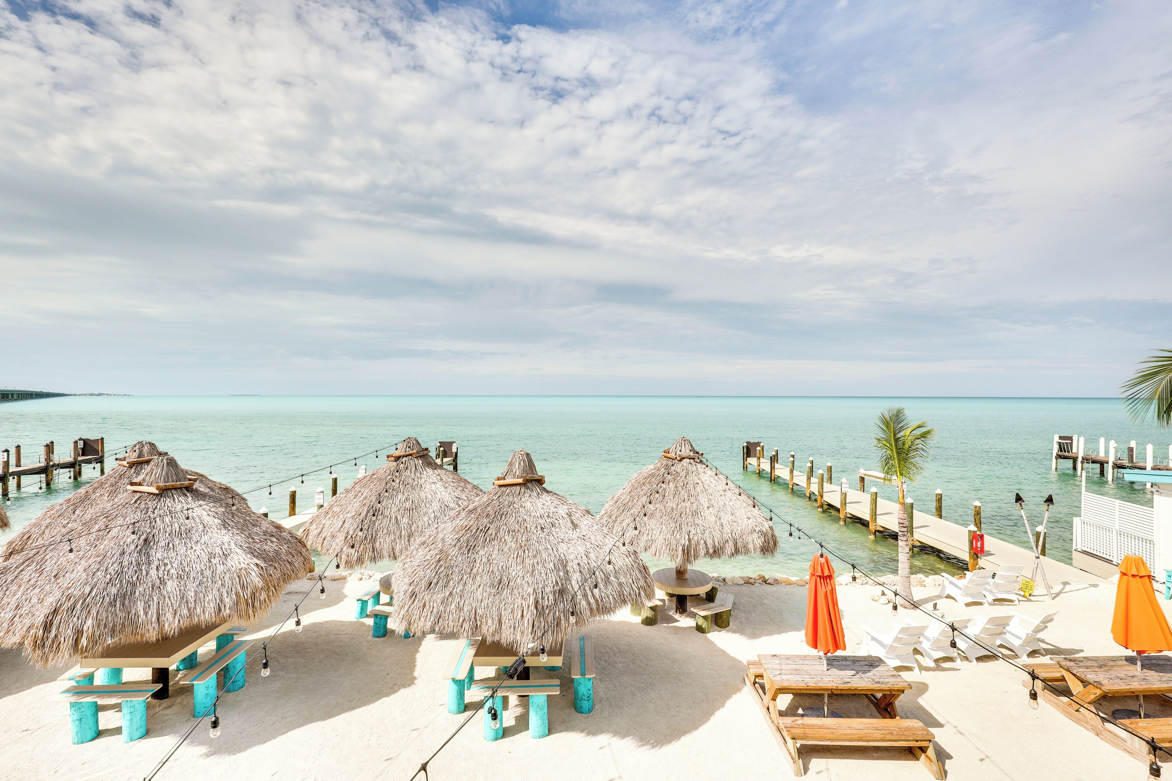 Enjoy a one-of-a-kind getaway in this Layton vacation rental offering a dock and a lovely beach along the Florida Keys! The rental is the perfect place to celebrate a honeymoon, special anniversary, or relaxing vacation with friends. The family dog is also welcome to join you! Inside, this Florida vacation rental is cheery with coral and teal accents, large windows, and tropical fish decor. Pull up a barstool at the breakfast nook for margaritas or begin preparations for a fresh seafood feast! The kitchen is fully equipped with modern appliances and a dining table with seating for four. It leads to an expansive worn-wood patio providing unique furniture and a thatching roof overlooking the sea. Outside, the grounds are reminiscent of a private island, with warped palm trees swaying in the breeze, a large white sand beach, and Tiki huts to relax under. The Atlantic expands as far as the eye can see, only punctuated by a dock. The water in front of the home is shallow, with a channel that enables a boat up to 30 feet in length to reach the dock.