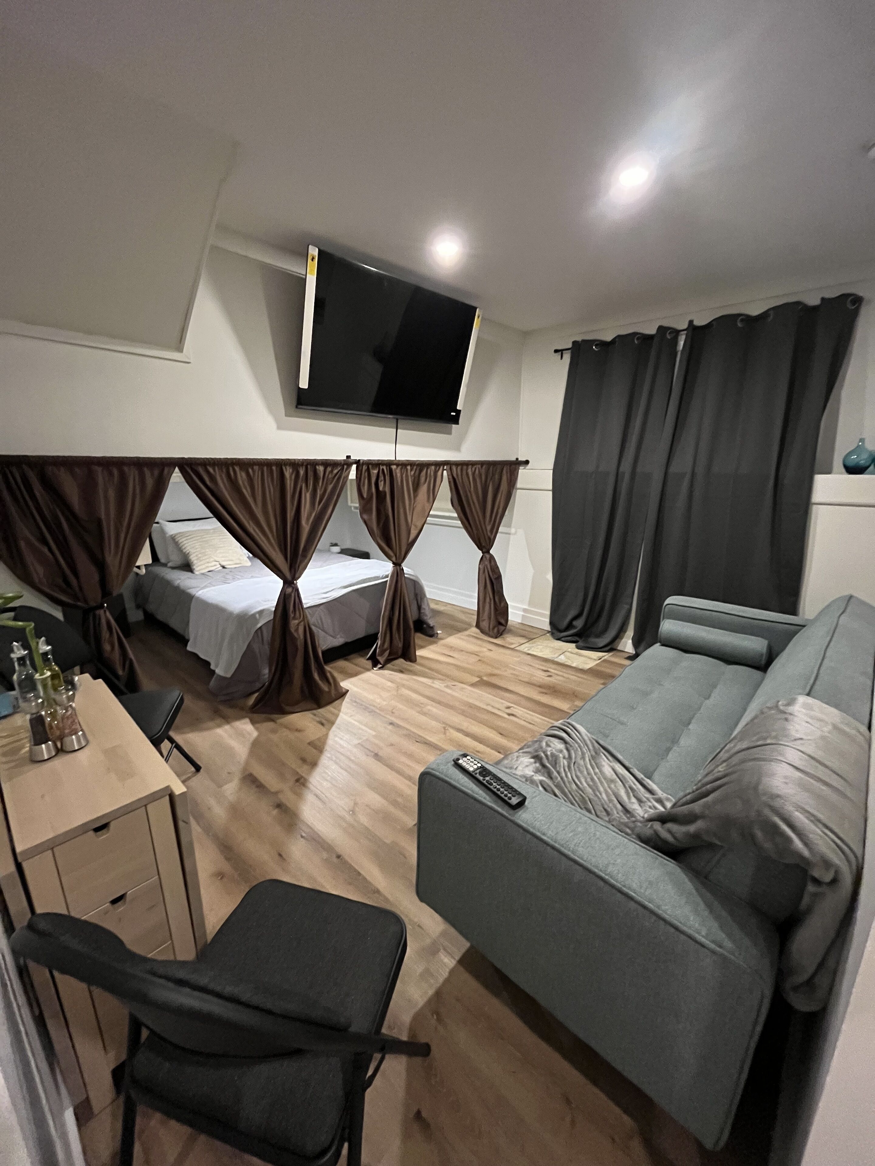 The room is cozy and has a 50" smart TV. Guest are able to long into their personal streaming accounts by scanning the provided barcode that each application provides upon login.