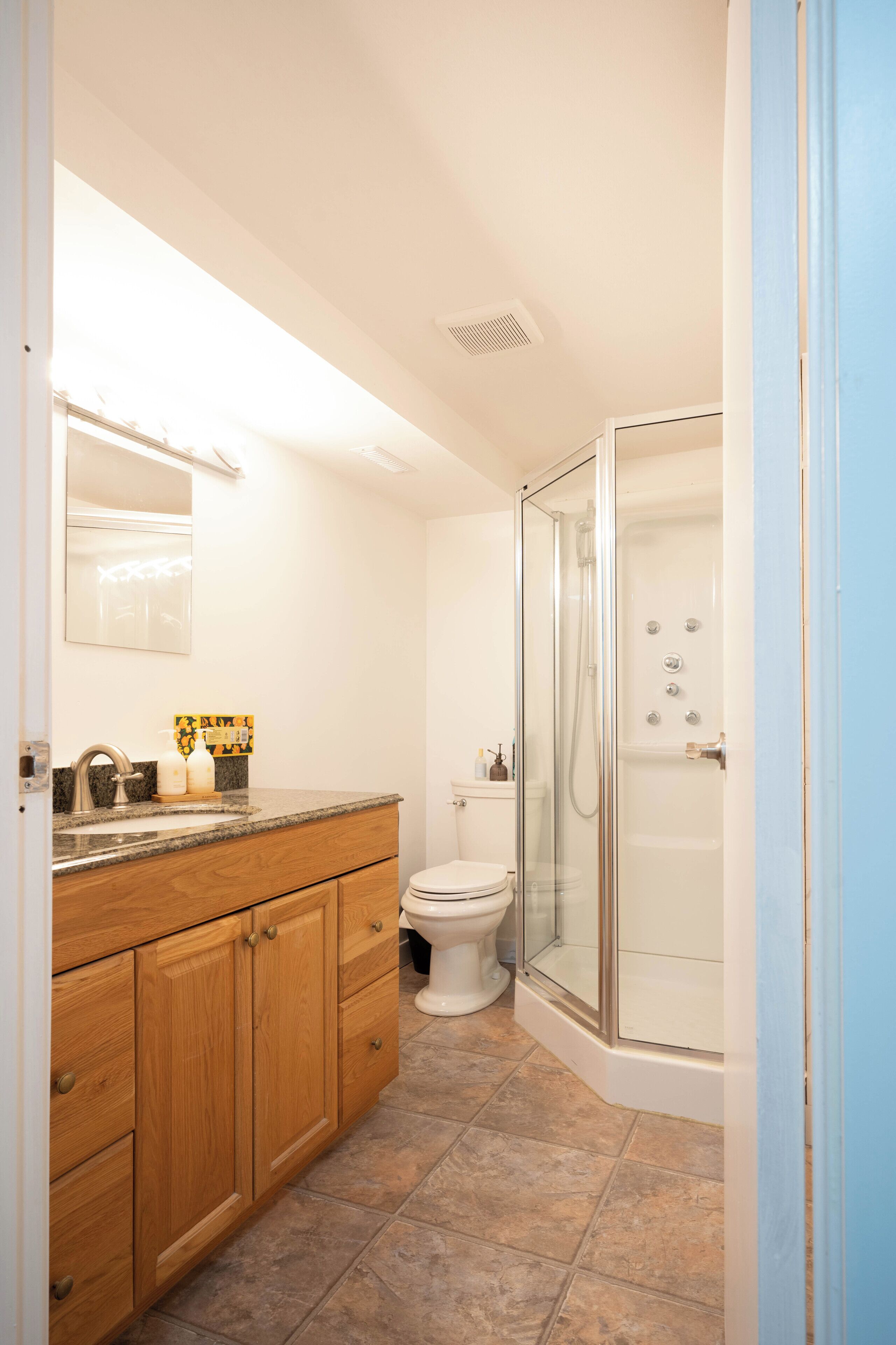 Spacious Bathroom: the shower, vanity, and foot-flush toilet spread out for your own private room.