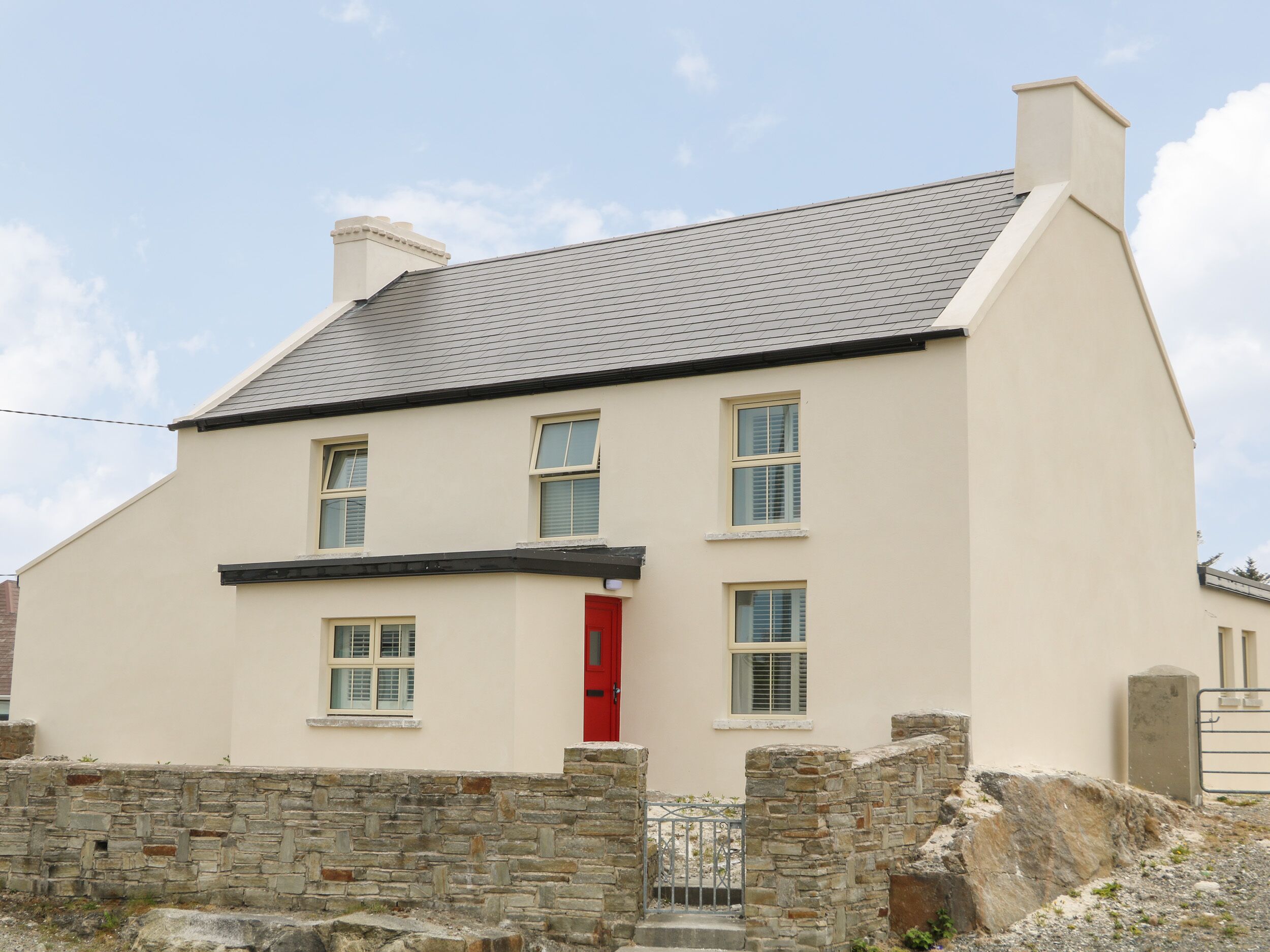 Teach Bridget is a detached cottage resting in Derrybeg in County Donegal. Hosting six bedrooms; a ground-floor super king-size with en-suite shower, a ground-floor super king-size with en-suite wet room, two king-size with en-suite showers, a ground-floor king-size with en-suite shower, and a family room with two super king-sizes (zip/link), along with a ground-floor cloakroom, this property can sleep up to 14 guests. There is a kitchen, a living/dining room, and a lawned garden, whilst outside there is off-road parking for six cars. Teach Bridget is a gorgeous holiday home for a group gathering to Ireland.