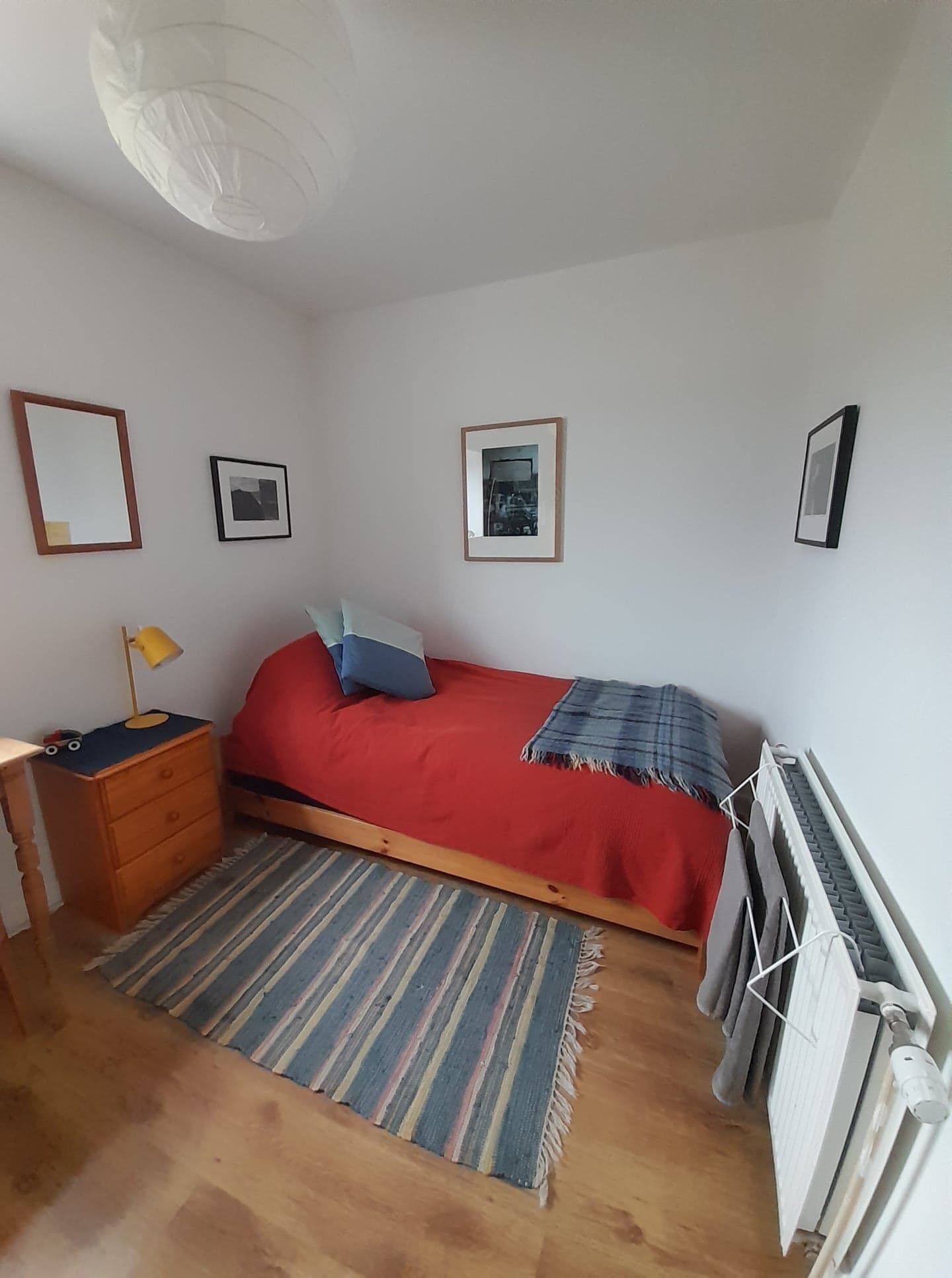 Entering the house, you have a choice of two front doors. The furthest door to the left is most convenient because you enter into the kitchen/dining/utility room. Also on the ground floor, in the heart of the home is a cosy yet spacious sitting room with an open fire, electric wood burner, TV and selection of books. There’s a double bedroom and the family bathroom on the ground floor too. On the first floor there are two twin bedrooms. And all three bedrooms have armchairs and views out across the village, the harbour and out to sea.