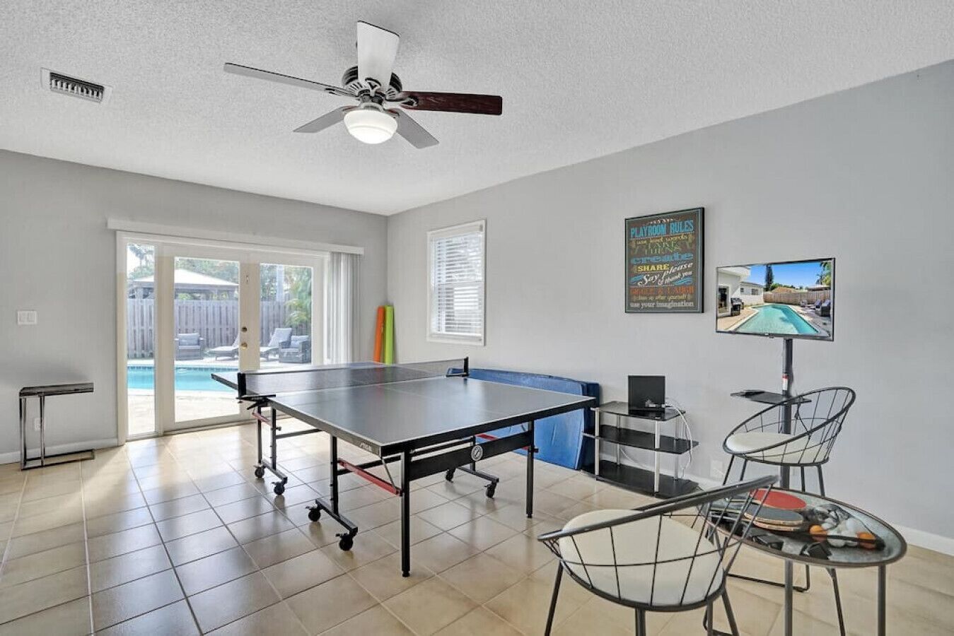 Large TV and games room that opens on to the pool on lower floor
