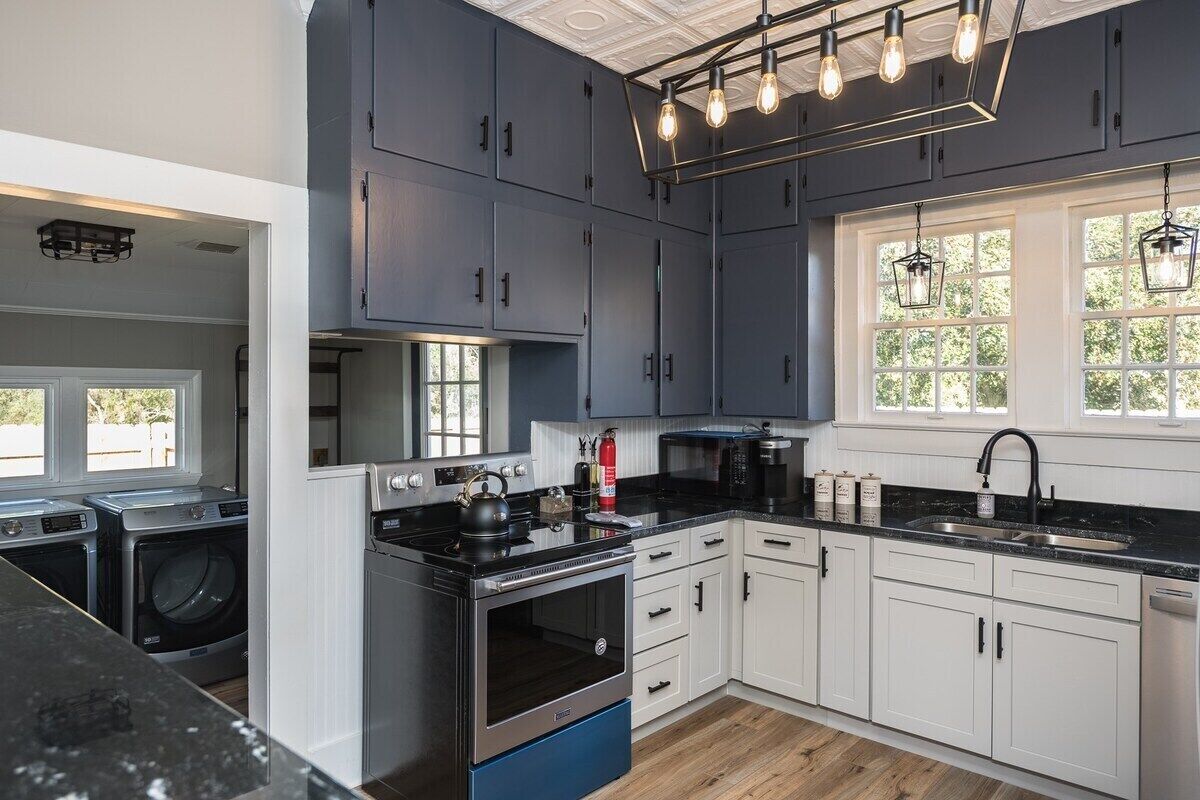 Large open concept living/dining room. Two spacious bedrooms with queen beds and one smaller bedroom with a full size bed. There is a large fully equipped kitchen, one beautiful full bath, and a laundry/mud room. Also a front porch/patio and fenced side/back yard.