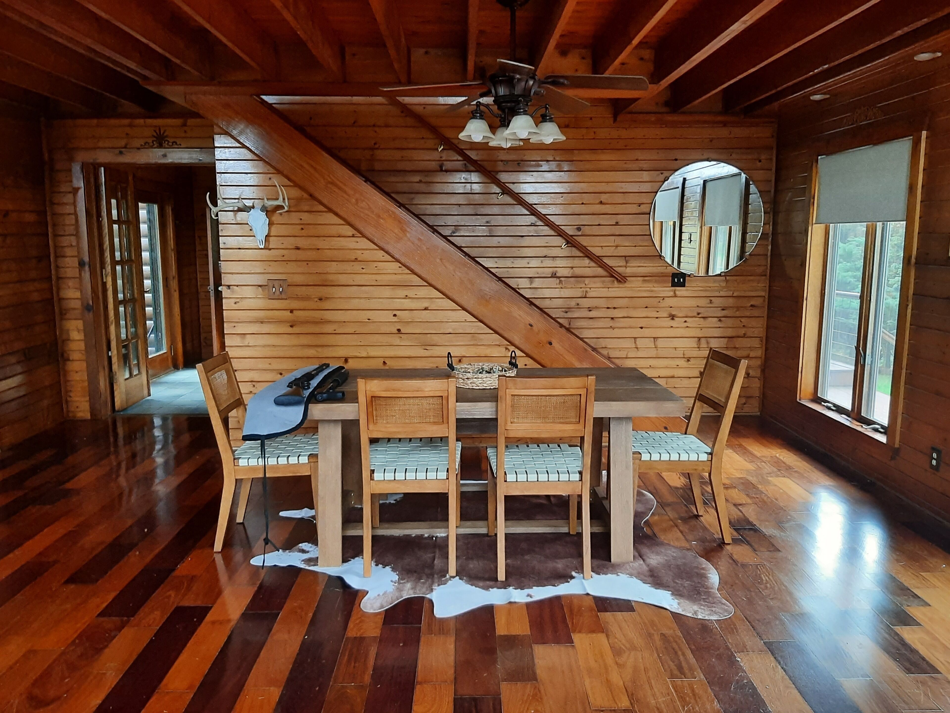 3 bedroom (4 bed), 2 bath, farmhouse that serves as a deer hunting lodge from October through February. The definition of peace and tranquility. You'll hear chirping birds but no airplanes and virtually zero road noise. Summer sunsets often bring a stunning display of fireflies. Roam on the 33 acres of pasture and woodlands. Canoe the pond on the lake at the end of the driveway. Get away to the quiet of this 100-year-old, but updated farmhouse.