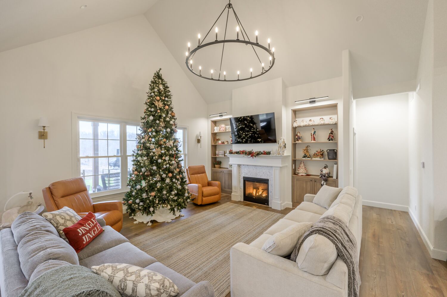HOME HIGHLIGHTS: 80″ Smart TV w/ surround sound, fireplace, dining table