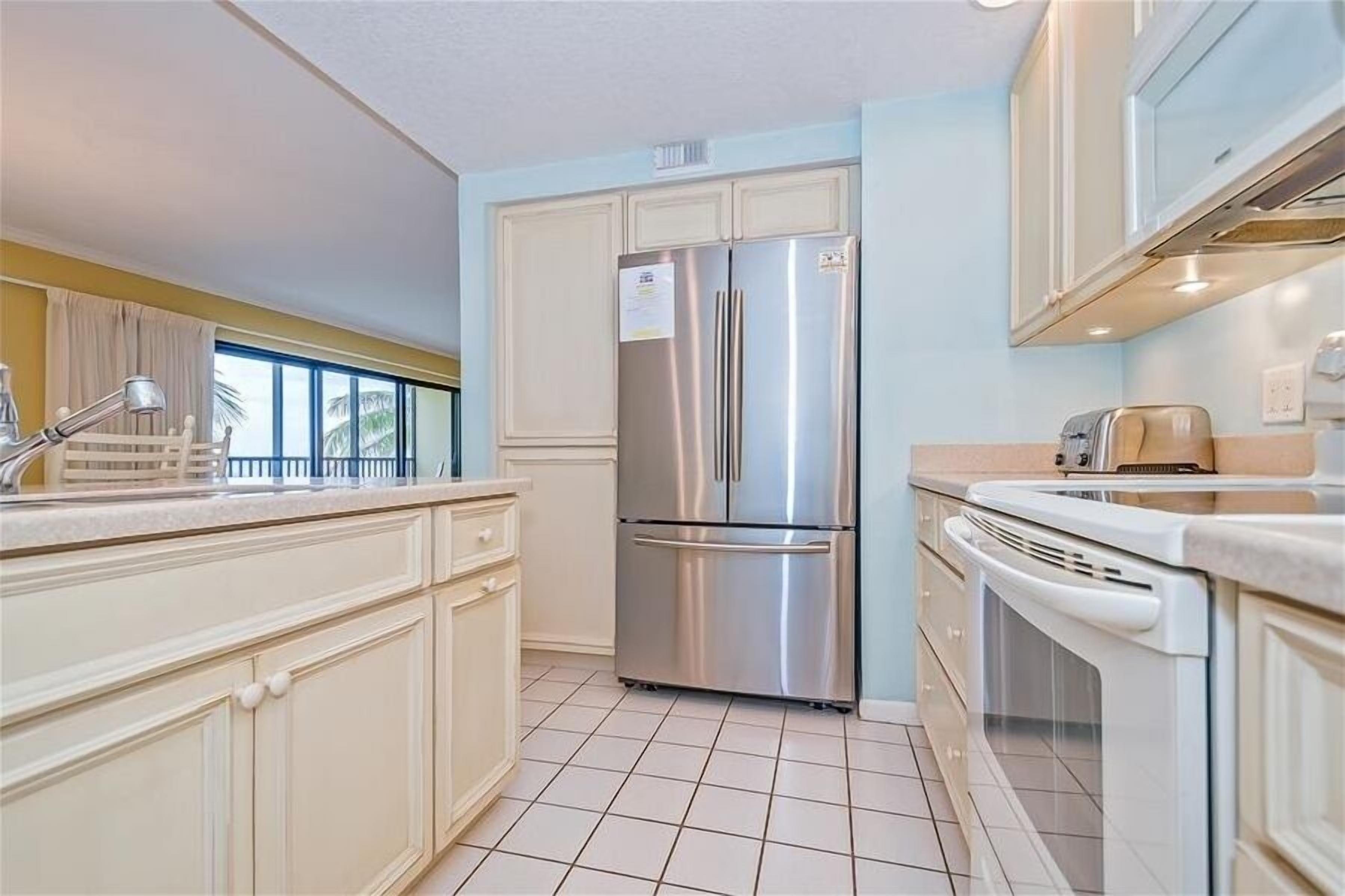 This completely updated 2nd floor condo is as close as you can get to the ocean. Just steps from the water at high tide. The 2 bedroom, 2 full bath unit sleeps 6, has an updated kitchen w quartz counter tops and is tastefully, and professionally decorated throughout. No carpet, LVP flooring installed 2024 throughout. The living room ,dining room, and screened lanai overlook the ocean . The master features a king with bath w walk in shower and large closet, the 2nd BR has 2 doubles w full bath. Watch the sunset from the screened patio with seating for 4 or