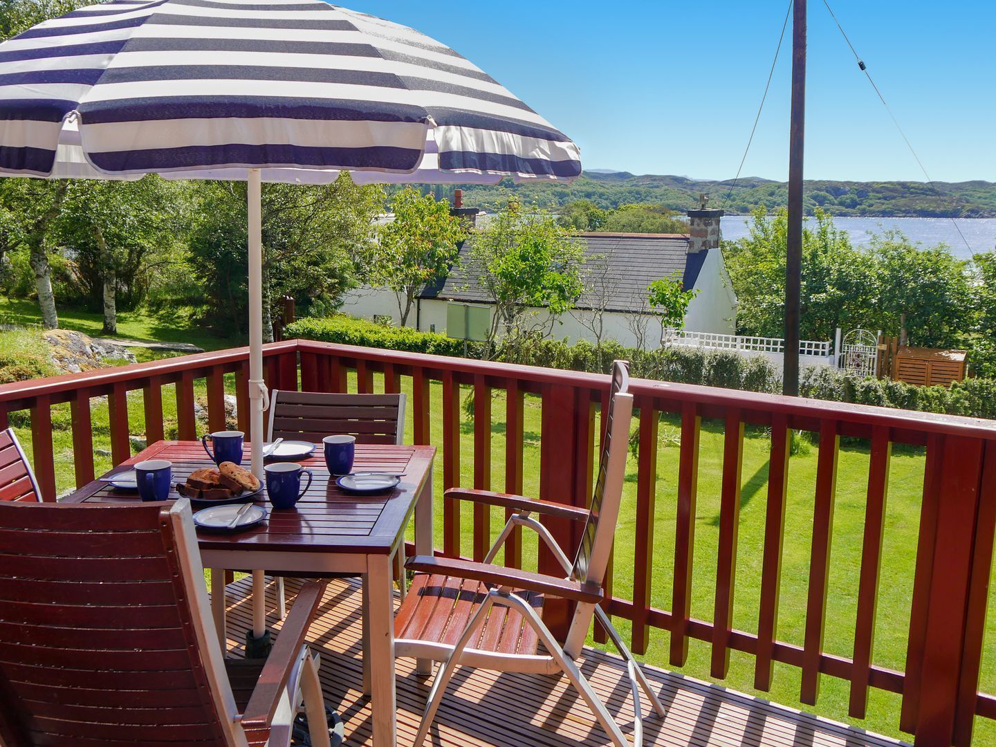 Shower Room: Walk-In Shower, Heated Towel Rail, Toilet. Electric central heating, electricity, bed linen, towels and Wi-Fi included. . Private decked area with garden furniture. Hot tub (private, at cost by direct arrangement with owner). 1-acre grounds with garden furniture (shared with other properties on-site). Bike store (shared with other properties on-site). Private parking for 2 cars. No smoking.. Perched in splendid isolation, Strathan Chalet unfolds its charm in an elevated position, commanding breathtaking panoramas over Lochinver and the rugged coastline. The property, adorned with lovingly chosen furnishings, envelops guests in a cocoon of comfort, ensuring a memorable stay. A thoughtfully equipped kitchen seamlessly integrates with the open plan living space, and patio doors open onto a private decked area where guests can bask in the tranquillity, surrounded by comfortable furniture that invites relaxation against the backdrop of stunning vistas.
