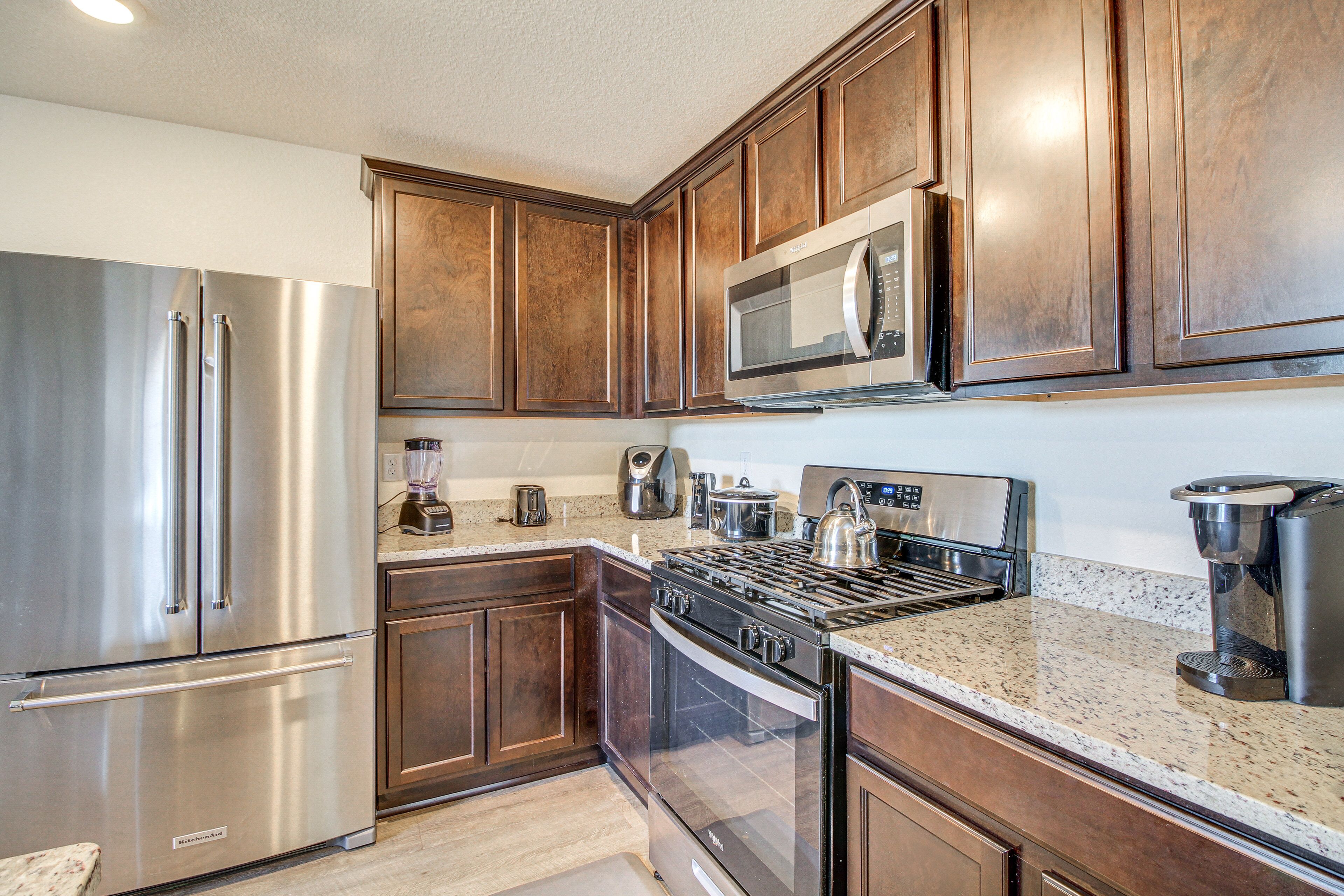 KITCHEN: Dishwasher, stove/oven, refrigerator, microwave, cooking basics, dishware & flatware, Keurig, air fryer, blender, toaster, Crockpot