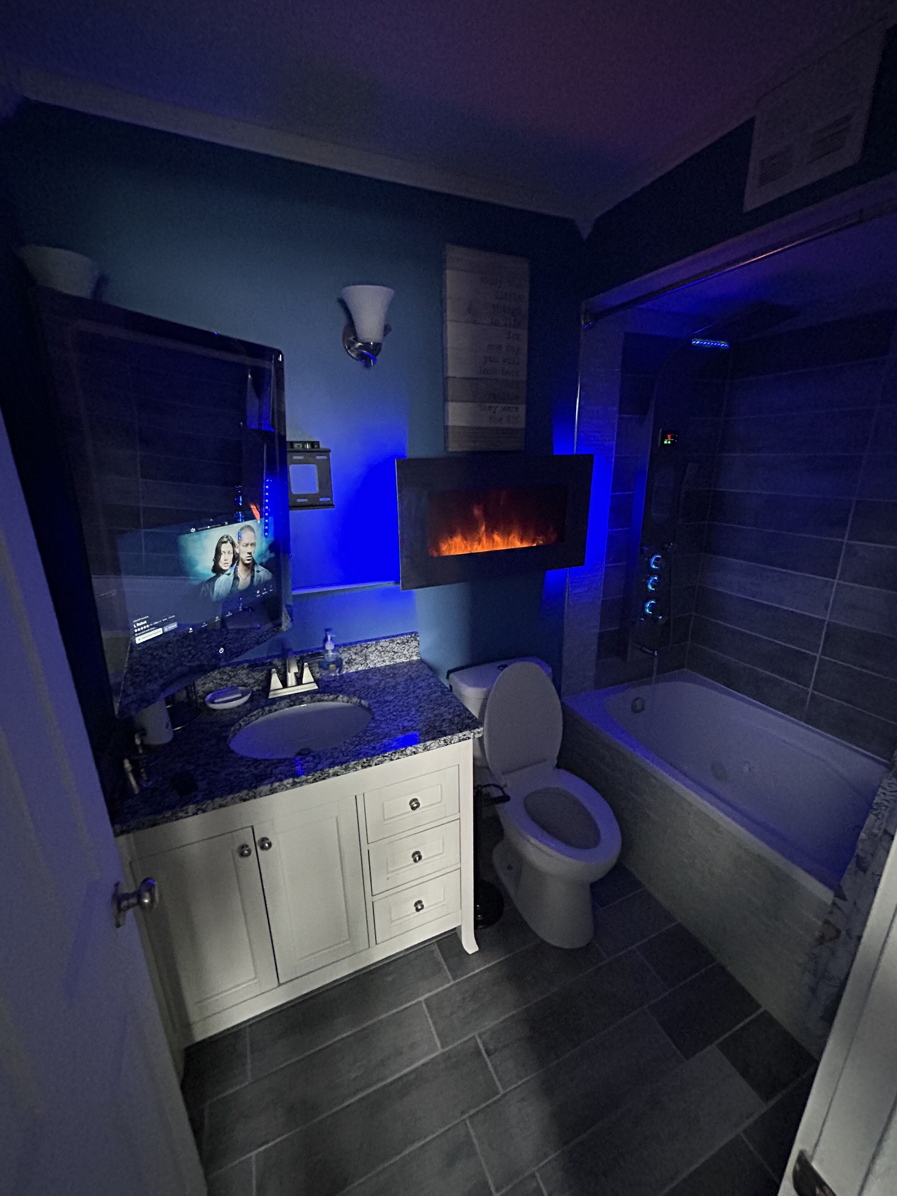 INDOOR LIVING: Smart TV w/ cable, electric fireplace, board games, dining table, shower/tub combo