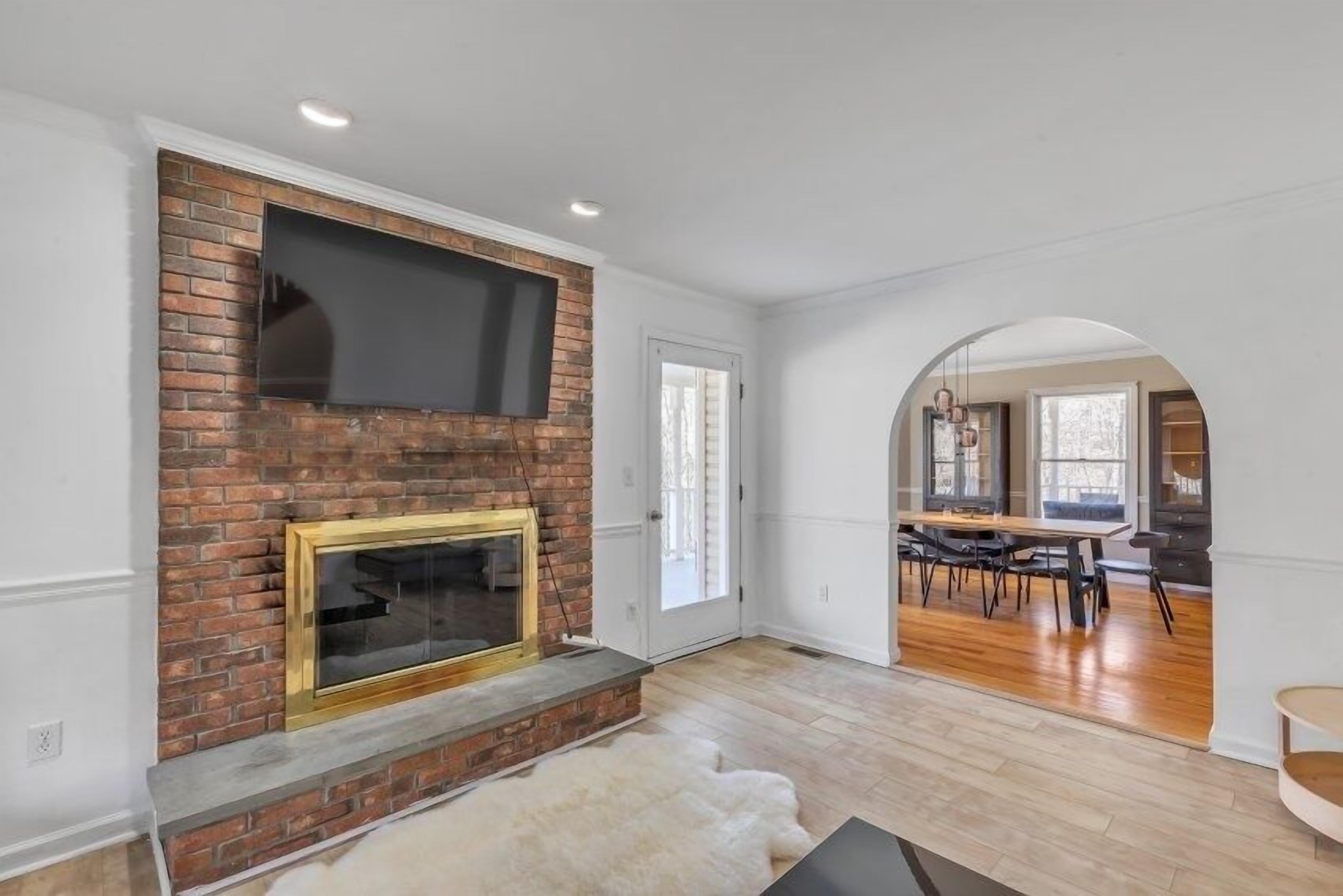 - Downstairs is the second living room and office space. This room also has a 65" smart TV (no cable but all the apps) and a wood burning fireplace. Additionally the bedroom downstairs is equipped with a king bed and acts as a second primary.