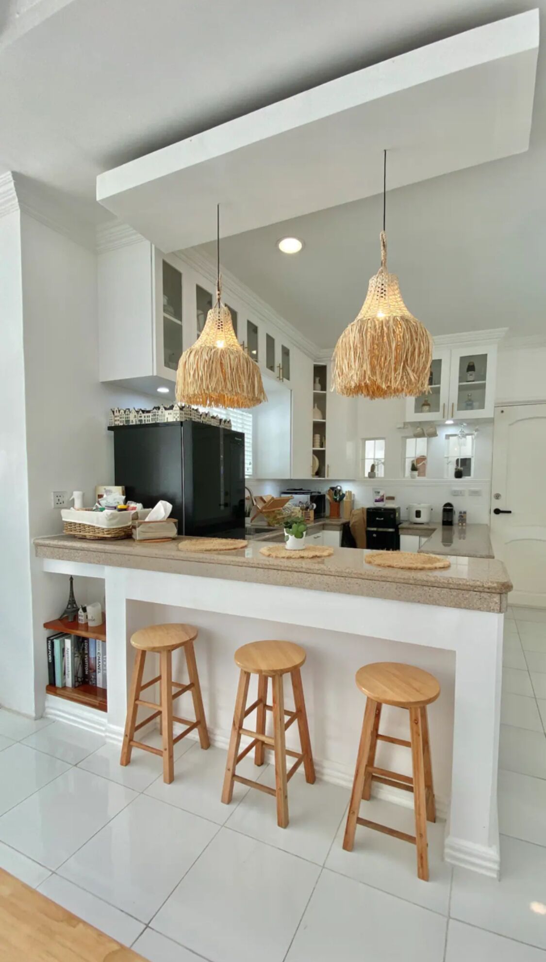 As you arrive, you're welcomed by a quiet street in the hills of Mataas na Kahoy. From the outside, the loft is simple, inviting—clean lines, soft whites, touches of native textures. Inside, it opens up into a cozy space where minimalism meets warmth. Sunlight filters through the windows, bouncing off white walls, the soft yellow glow of abaca chandeliers lighting up the corners.