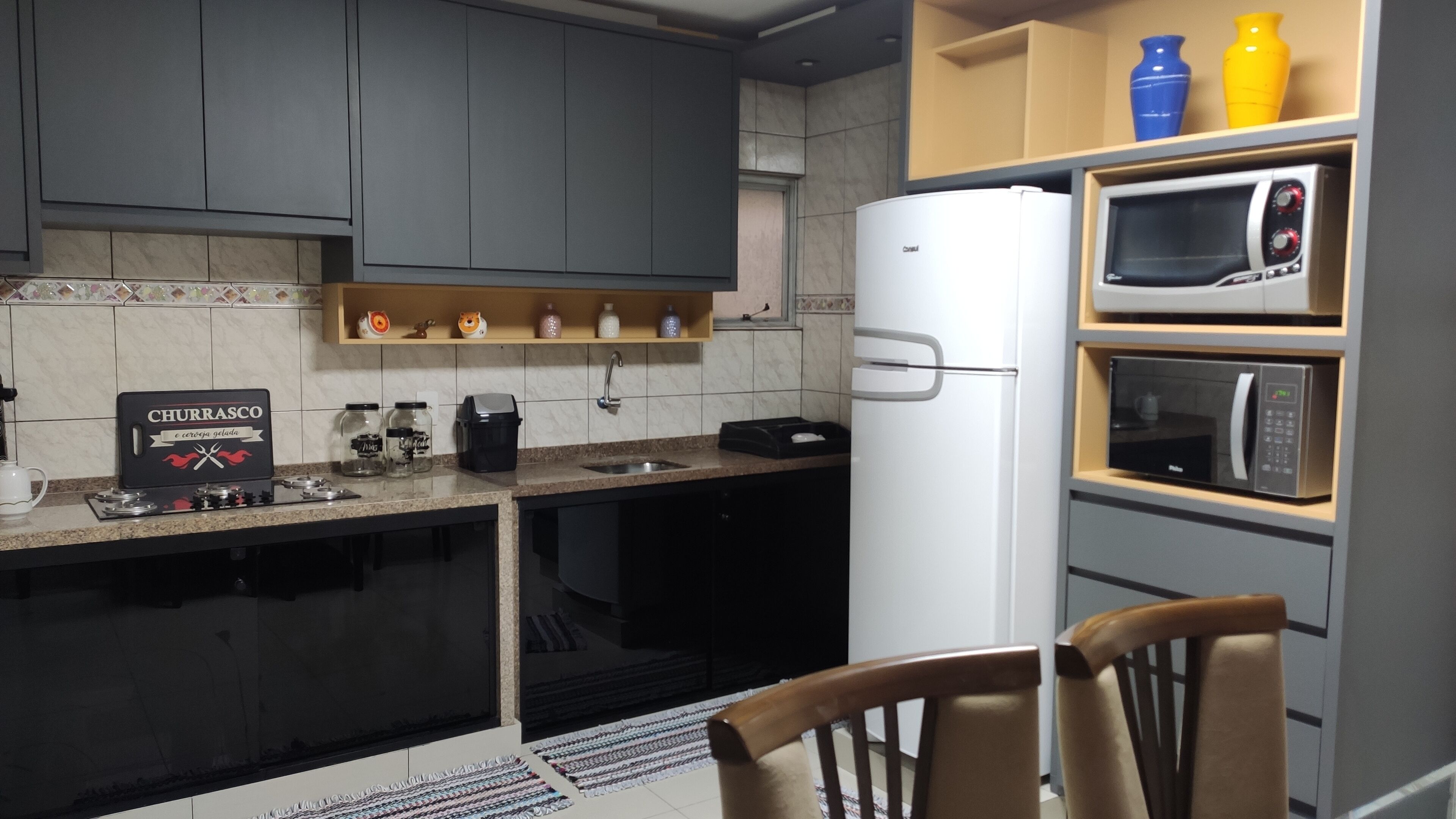 Beautiful Penthouse two blocks from the sea in Bal. Caiobá, Matinhos-PR, with 3 bedrooms (one en-suite), living room, kitchen with gourmet space - barbecue -, BWC, laundry area, pantry, large balcony. The suite has wardrobe, Smart TV, double bed, single auxiliary bed attached to a double bed - Ortobom mattresses -, air conditioning, ceiling fan, minibar, frame, mirror, pillows, blankets and mattress protector. The double room has a wardrobe, Smart TV, double bed, single auxiliary bed attached to a double bed - Ortobom mattresses - comfort puff, air conditioning, ceiling fan, frame, mirror, blankets and mattress protector. The single room has a bunk bed - Ortobom mattresses -, ceiling fan, blankets and mattress protector. The room has a sofa bed, comfort puff, panel, Smart TV with Netflix, home theater, ceiling fan, decorative objects, sideboard - with tic-tac-toe, cards, dice, track, chess, skates etc. The kitchen is fully equipped with Brastemp appliances with refrigerator, stove, microwave and also has household items and barbecue. The 17 square meter veranda is equipped with chairs, table and umbrella with a beautiful view of one of the busiest streets in Caiobá. Service area has six pack, clothesline and washer and dryer. Internet access and a covered garage for one car.