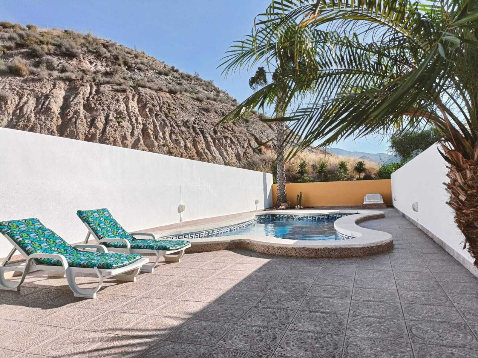 This lovely detached villa is within walking distance to shops, bars and restaurants, this property has a large private pool with surrounding sun bathing terrace, sunbeds (4) and Gas BBq. An awning over ther rear terrace gives you the option of shade. The villa has raised walls for privacy, the garden has mature trees, the shaded terrace at the front has dining options. The WC to the rear of the property is easily accessed from the pool area, the rooftop solarium offers views to the surrounding mountains. Internally the lounge has 2 sofas, TV with English Full SKY/BT sport and movie pack or Spanish channels, dining room seating 4, kitchen with dishwasher, fridge freezer, washing machine, utensils and all the crockery you need, one double and one twin bedroom, family shower room make up this well furnished comfortable accommodation. Bedding and inside towels are provided. There is a log burner for the winter months Off road parking in the drive.